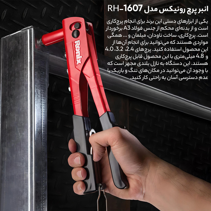توضیحات سری: قطعات فولادی مقاوم، پشتیبانی از میخ پرچ های 2,4 تا 4,8 میلی متر، دسته های روکش شده با PVC، قابلیت پرچ کاری انواع میخ های از جنس استیل و آلومینیوم، ضد لغزش و ضد تعریق