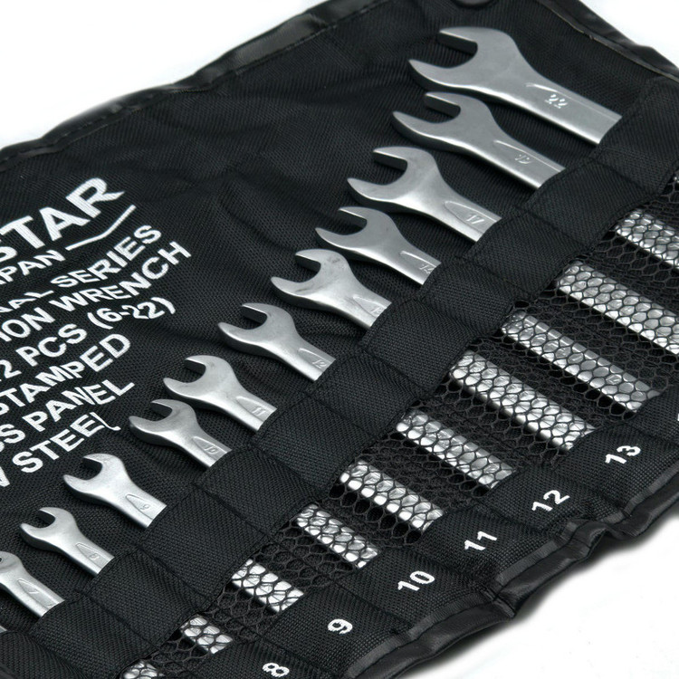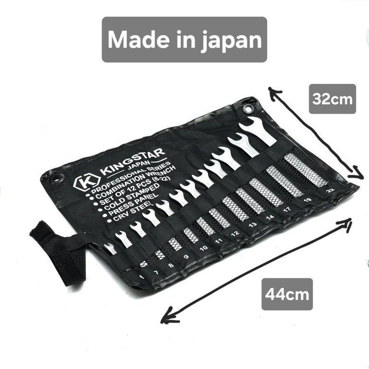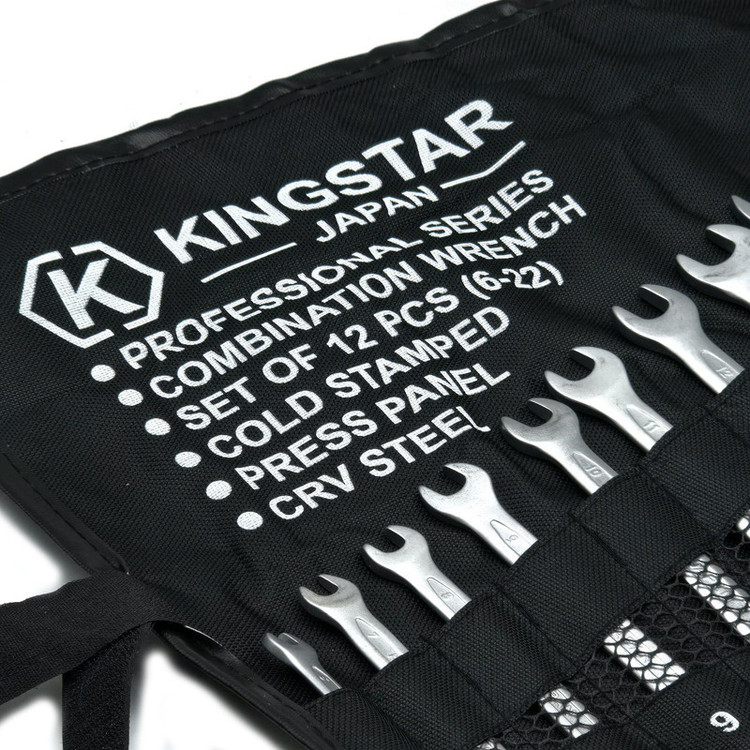 مشخصات کلی مجموعه آچار 12 عددی کینگ استار : محصول کشور ژاپن سایز 6 الی 22 یکسر تخت و یک سر رینگ روکش کروم وانادیوم استیل دارای کیف آچار قابل نصب بروی دیوار