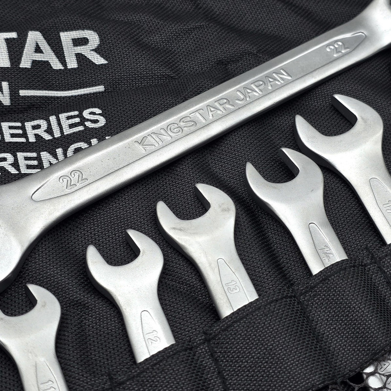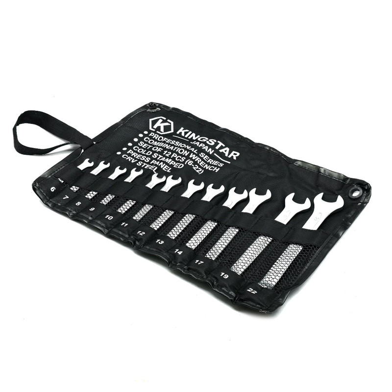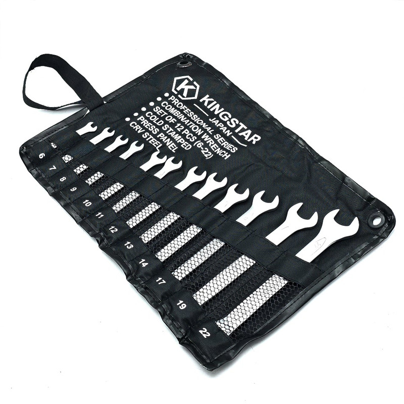 مشخصات کلی مجموعه آچار 12 عددی کینگ استار : محصول کشور ژاپن سایز 6 الی 22 یکسر تخت و یک سر رینگ روکش کروم وانادیوم استیل دارای کیف آچار قابل نصب بروی دیوار