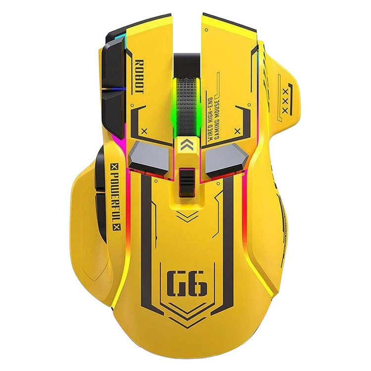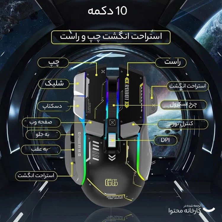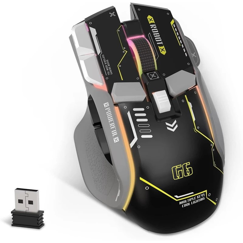 ماوس G6 یک ماوس بی سیم مخصوص بازی سایلنت کلیک،بادقت بسیار خوب،ارگونومی استثنایی و قابلیت استفاده به صورت باسیم(کابل USB به TYPE C) و بی سیم(دانگل و بلوتوث) است.شاید اصلی ترین ویژگی این ماوس ارگونومی و طراحی استثنایی ماوس باشد.