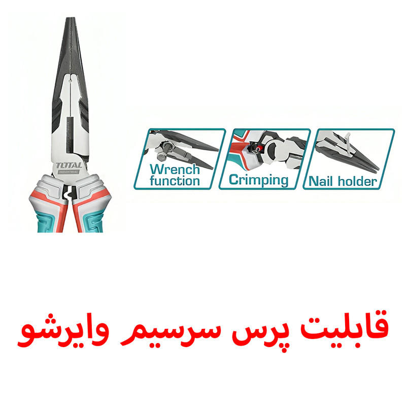 انبر دم باریک و پرس سرسیم وایرشو ( دوکاره ) فوق صنعتی توتال مدل THT220806S سایز 8 اینچ ، یک محصول با ارزش خرید بسیار بالا از شرکت توتال میباشد . کارکرد دوم و مهم این انبر دم باریک پرس انواع سوکت های سرسیم وایرشو می باشد که با هوشمندی خاصی توسط شرکت توتال در این انبر تعبیه شده است . در قسمت گلوئی فک این انبر قسمتی برای پرچ سرسیم های وایرشو قرار دارد .