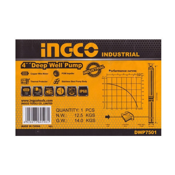 پمپ شناور 11.4 اینچ 80 متری اینکو مدل DWP5501، این دستگاه دارای توان 75 وات بوده و از گروه پمپ های سانتریفیوژ طبقاتی مستغرق، جهت پمپ چاه آب و سیستم آبیاری در مزارع و باغ ها، افزایش فشار، شستشوی صنعتی، آبنماها، نیروگاه ها، آبرسانی مسکونی،اطفاء حریق و آتش نشانی، سیستم آبیاری بارانی، تامین آب اظطراری، حوضچه ها و پرورش ماهی ها ، زهکشی آب های تحت الارض و کنترل سیل استفاده کرد. اساس کار این دستگاه به این صورت است که سیال از چشمه یا مرکز پروانه اول وارد پمپ شده و پس از خارج شدن از محیط پروانه وارد طبقه بعدی شده و از خروجی آخرین پروانه خارج شده و بدین ترتیب فشار آب را افزایش می دهد.این محصول به همراه خازن راه انداز اورجینال اینکو و 20 متر کابل عرضه میگردد