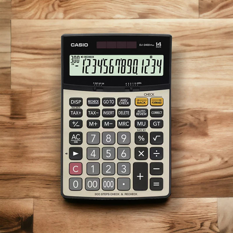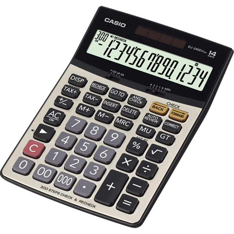 شرکت کاسیو یکی از نامهای آشنا در تولید محصولات الکترونیک مخصوصاً درزمینهی ساعت و ماشینحساب است. ماشینحساب DJ-240D Plus درواقع مدل پیشرفتهتر دستگاه DJ-240D است که در آن به امکانات دستگاه افزوده شده است. این ماشینحساب که در دستهی مدلهای رومیزی قرار میگیرد قادر است تا 14 عدد را بر روی صفحهنمایش بزرگ خود نمایش دهد و ازاینرو برای انجام محاسبات بزرگتر با اعداد بیشتر مناسبتر است. برق مصرفی دستگاه همانند دیگر مدلهای کاسیو از دو منبع باتری و پنل خورشیدی تأمین میشود و درصورتیکه در محیطهایی با نور کافی باشید به باتری نیازی نخواهید داشت. شاید بتوان گفت که مهمترین قابلیت این مدل توانایی دستگاه برای کنترل محاسبات انجام شده تا 300 مرحله است که در صورت طولانی بودن محاسبات امری بسیار مهم است زیرا احتمال اشتباه در محاسبات طولانی بسیار بالاست. برای کنترل محاسبت با این قابلیت میتوانید به 2 صورت مرور دستی و یا اتوماتیک عمل کنید. این مدل را میتوان مناسب استفاده برای اهداف تجاری و فروشگاهی در نظر گرفت و ازاینرو محاسبهی مالیات هم در آن تعبیه شده است.