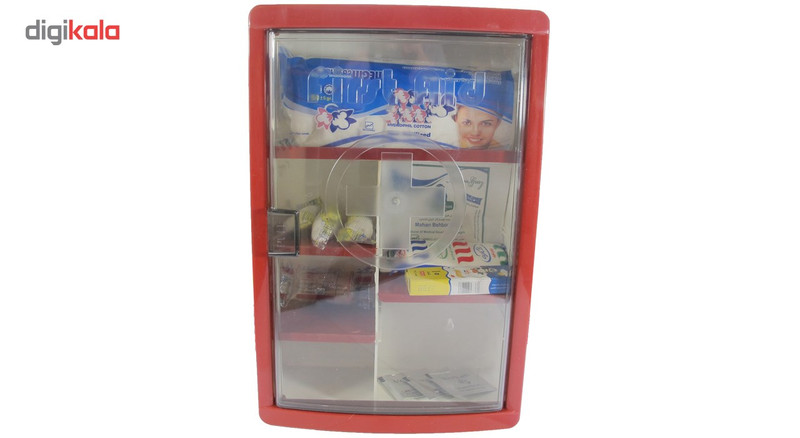 محتویات جعبه کمکهای اولیه: چسب زخم , دستکش , گاز استریل , باند زخم , چسب باند , پد الکلی , پنبه , چسب حلقه ای
