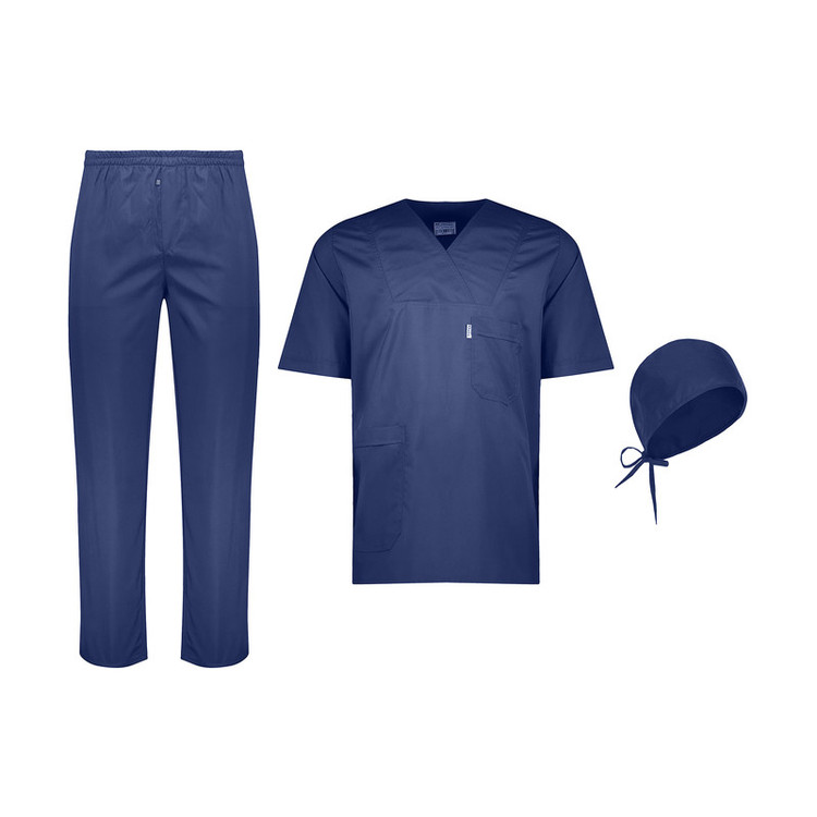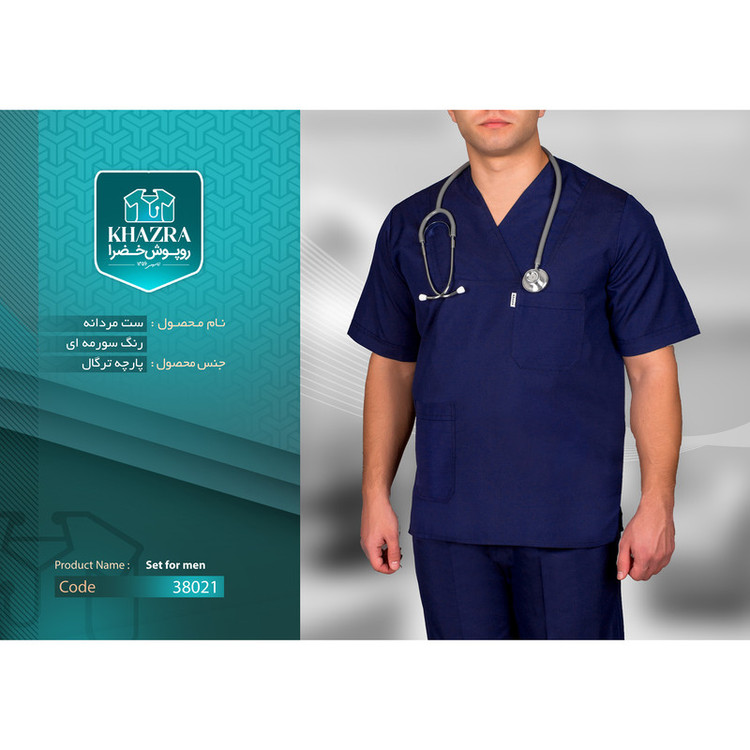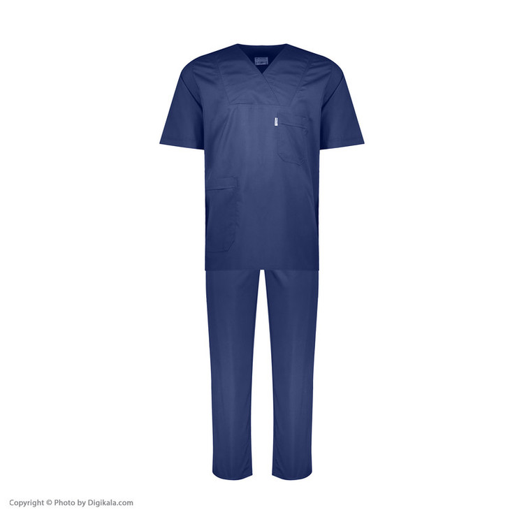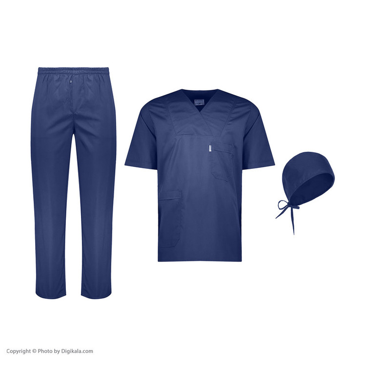 روپوش + شلوار + کلاه پارچه ترگال رنگ سورمه ای روپوش دارای یک جیب بالا و یک جیب پایین شلوار تمام کش