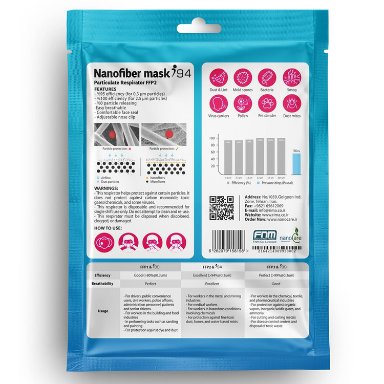 استاندارد ایمنی و محافظتی: EN149:2010 , پروانه ساخت بهداشت از وزارت بهداشت، درمان و آموزش پزشکی