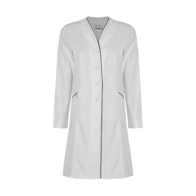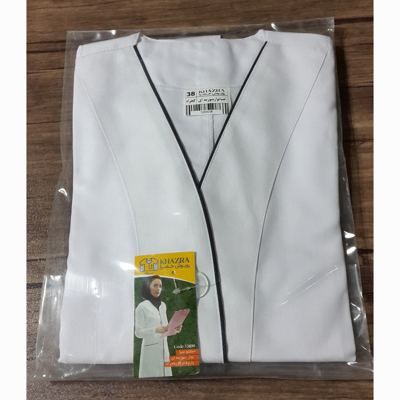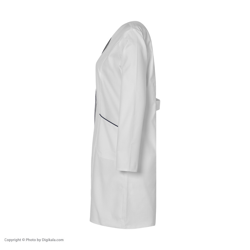 پارچه کجراه دارای بندک پشت دارای ساسون پشت جهت باریک شدن کمر برش عصایی دو جیب بغل بدون یقه نوار سورمه ای
