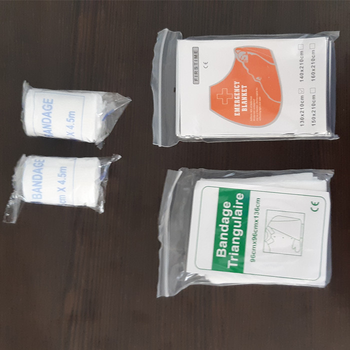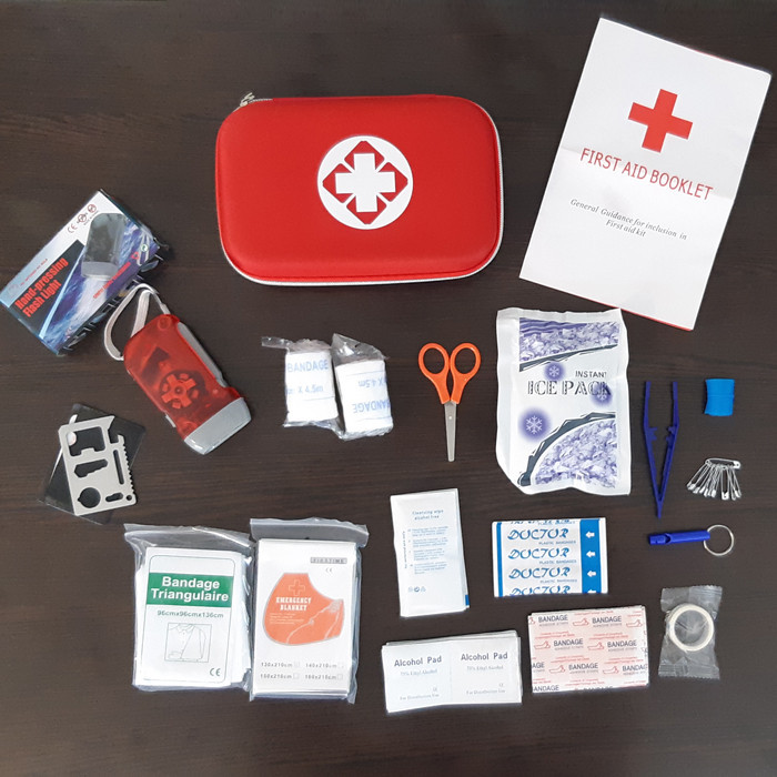 سنجاق قفلی , سوت , شریان بند , چسب زخم , قیچی , کمپرس یخ , پد الکلی , باند زخم , بروشور آموزشی , پتوی نجات , پنس , چراغ قوه , چسب باند , چسب حلقه ای