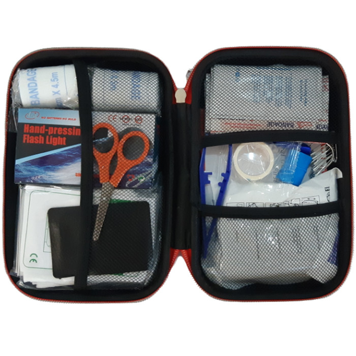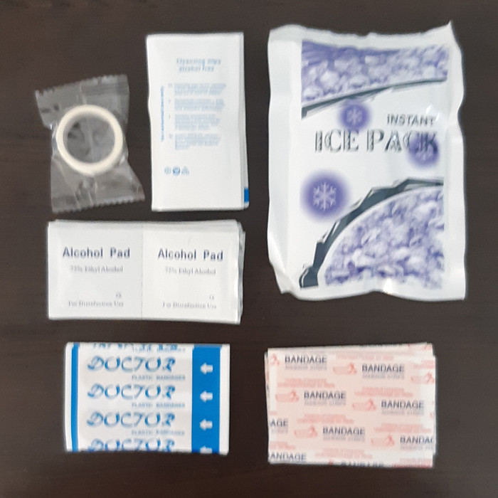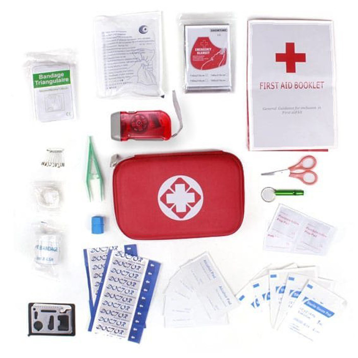 سنجاق قفلی , سوت , شریان بند , چسب زخم , قیچی , کمپرس یخ , پد الکلی , باند زخم , بروشور آموزشی , پتوی نجات , پنس , چراغ قوه , چسب باند , چسب حلقه ای