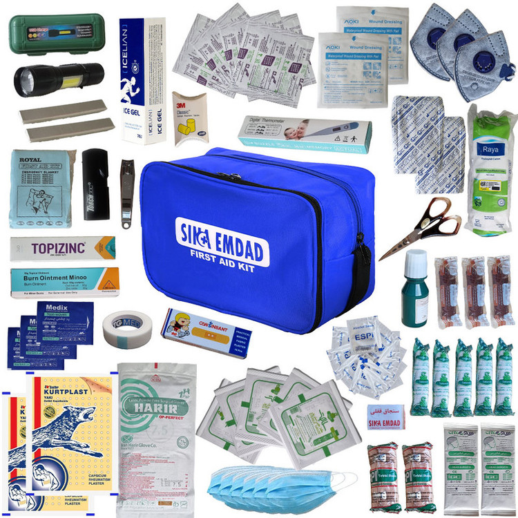 محتویات جعبه کمکهای اولیه: باند دور بافت , باند زخم , باند کشی , بتادین , پانسمان آماده , پتوی نجات , پد الکلی , پد چشمی , پنبه , تب سنج , چراغ قوه , چسب زخم , چسب ضد حساسیت , دستکش لاتکس , سرجی فیکس سر , سنجاق قفلی , قیچی , گاز استریل , گاز وازلینه , ماسک