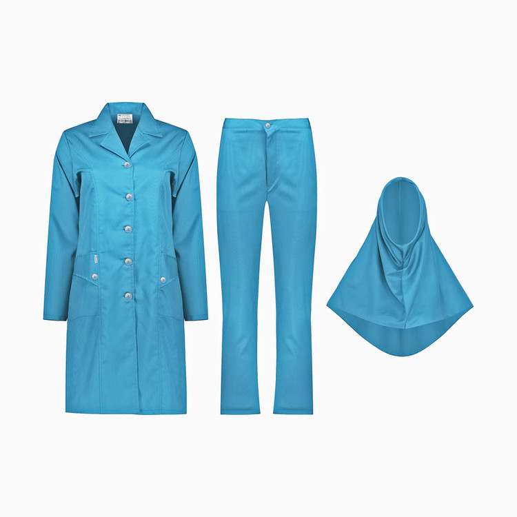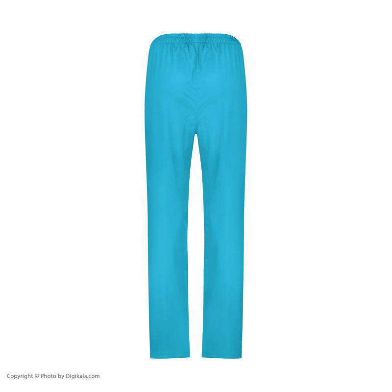 روپوش + شلوار +مقنعه پارچه ترگال رنگ فیروزه ای برش عصایی دارای دو جیب پایین شلوار پشت کشدار