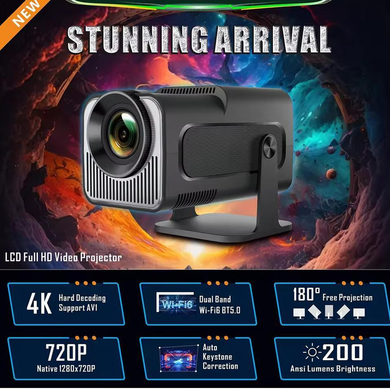و همچنین گرافیک Mali-G31 supports OpenGL ES3.2,Vulkan 1.1,and OpenCL2.0 می باشد که باعث عملکرد عالی این دستگاه شده است.این ویدئو پرژکتور تصویری با ابعاد 55 تا 85 اینچ را برای شما از 1 تا 4 متری فراهم می کند.با استفاده از اسپیکر 3 واتی صدای ایده آل خروجی برای شما فراهم شده است.صدای فن داخلی آن دارای نویز کمتر از 25 دسی بل است که ایده آل است.قابلیت تغییر زاویه 180 درجه باعث شده به راحتی تصویر را روی دیوار یا روی سقف برای شما ایجاد نماید.این پروژکتور دارای پورت USB و AUX و HDMI نیز می باشد.برق این دستگاه از برق شهری 110-220V تامین می شود.به جرات می توان گفت جدیدترین نسل ویدئو پرژکتور های موجود در بازار در اختیار شما قرار داده شده است.حافظه داخلی 8 گیگ و رم 1 گیگ برای این ویدئو پرژکتور تعبیه شده است.همچنین این محصول از بلوتوث ورژن 5 پشتیبانی می کند.