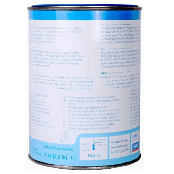این گریس بلبرینگ خودرو همه منظوره اس کا اف بر پایه روغن معدنی و صابون لیتیم بوده و دارای کیفیت بسیار بالایی می باشد. این گریس لیتیومی ویژه با روغن معدنی درجه یک پایداری حرارتی فوق العاده ای دارد به ویژه در حین کار با فاصله در دمای 140 درجه سانتی گراد یا تا 150 درجه سانتی گراد، بنابراین برای یاتاقانهای چرخ مجهز به ترمز دیسکی در وسایل نقلیه مناسب است. محدوده دمایی فعالیت این گریس از 30- تا 140+ درجه سانتی گراد می باشد. برند تولید کننده اس کا اف این گریس واقع در کشور سوئد است.