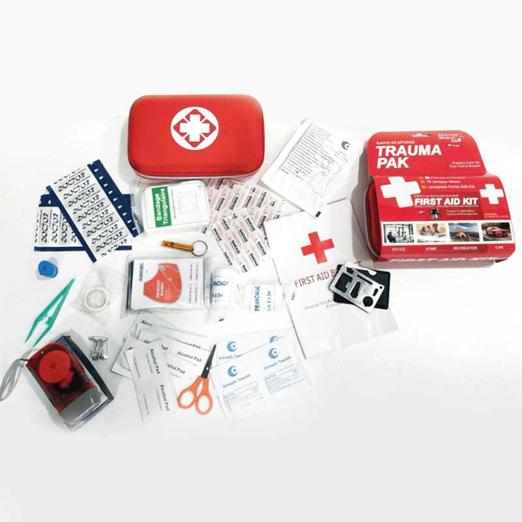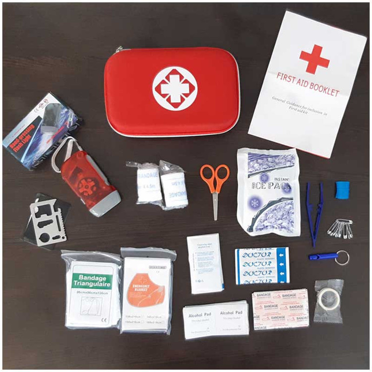محتویات جعبه کمکهای اولیه: باند زخم , پتوی نجات , پد الکلی , پنس , چراغ قوه , چسب باند , چسب حلقه ای , چسب زخم , سنجاق قفلی , سوت , قیچی , کمپرس یخ , گاز استریل