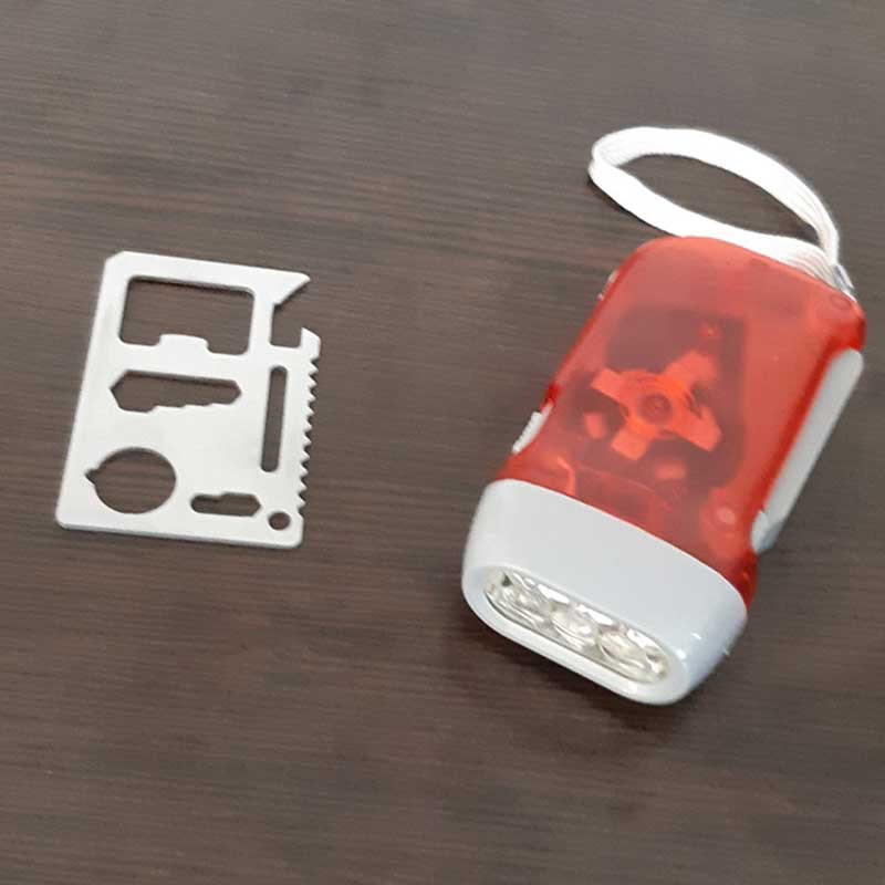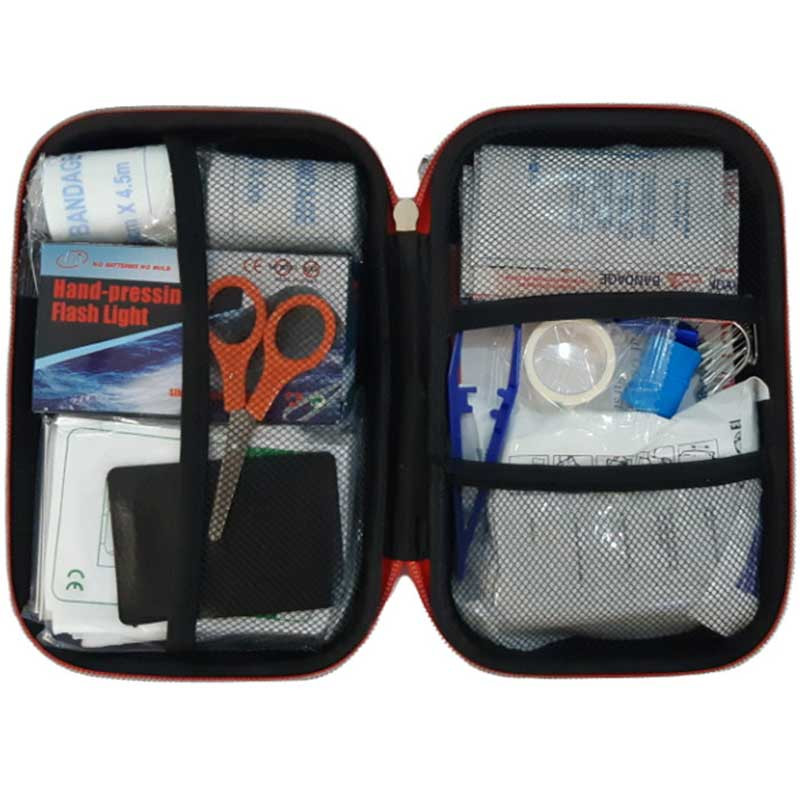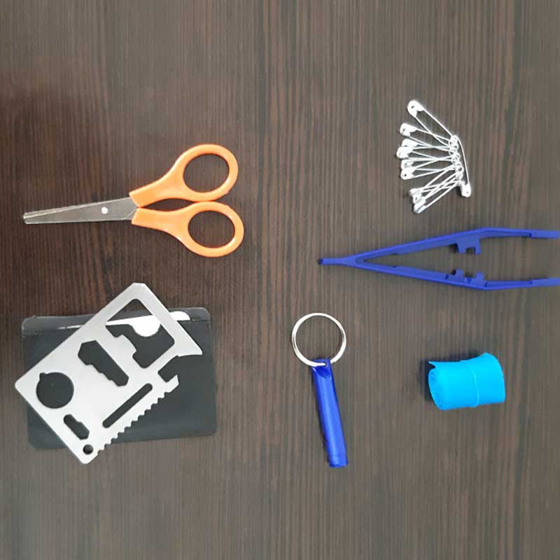 محتویات جعبه کمکهای اولیه: باند زخم , پتوی نجات , پد الکلی , پنس , چراغ قوه , چسب باند , چسب حلقه ای , چسب زخم , سنجاق قفلی , سوت , قیچی , کمپرس یخ , گاز استریل