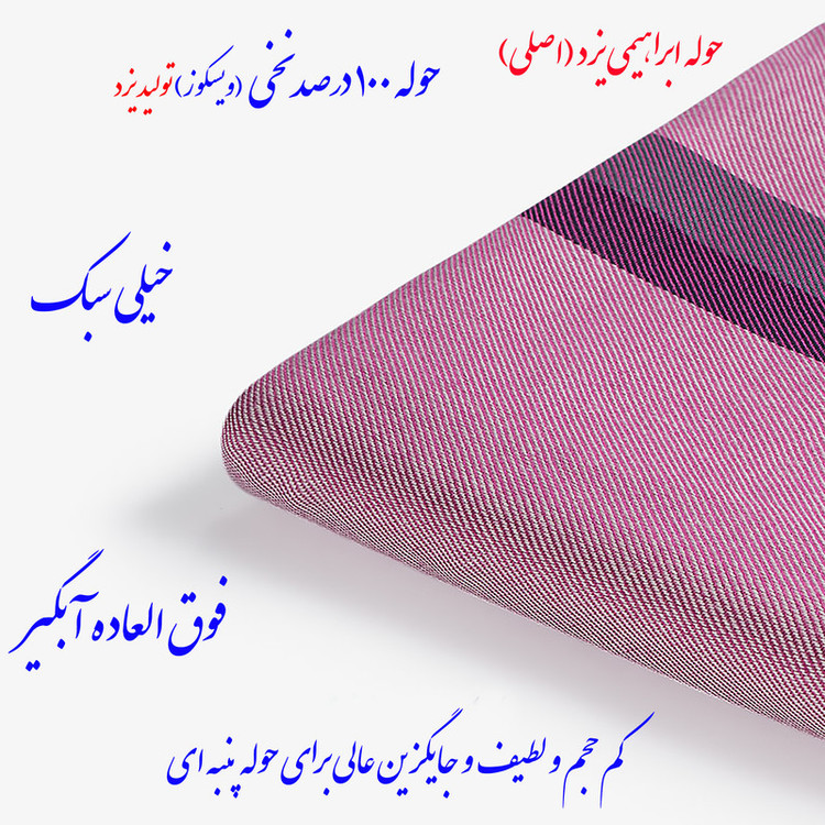 حوله حمام و استخری ابراهیمی یزد سایز کاربردی 110*160 سانتیمتر تولید شده از 100 درصد نخ ویسکوز که بسیار بسیار جاذب آب بوده و در عین سبکی و کم حجمی طوری بدن را خشک می کند که شما را از هر نوع حوله از جنس دیگری بی نیاز می کند. تغییر سلیقه مردم به حوله های کم حجم، سبب رشد تولید این نوع از حوله ها شده است. ویژگی خاصی که این حوله های تولید شده با نخ ویسکوز دارند این است که چنانچه بر روی بدن خیس قرار دهید گرمای مطبوعی به بدن می دهند که باعث تعجب شما خواهد شد. همین وِیژگی به همراه جذب آب شدید و حجم کم و وزن بسیار پایین این نوع حوله را به محصول ویزه ای تبدیل کرده است. توجه داشته باشید این نوع حوله که بسیار پرفروش شده اند، پرز ندارند و از الیاف طبیعی اند و هیچ گونه حساسیتی ایجاد نمی کنند. به خودتان اجازه دهید یک مرتبه سلیقه تان را عوض کنید و از این نوع حوله ها خرید کنید. محصول غیر قابل باوری را تجربه خواهید کرد و مسیر شما را در خرید های آینده تغییر خواهند داد. بسته بندی جدید این حوله، نایلون وکیوم و بهداشتی است و سبب شده که این حوله نسبت به گذشته، بسیار شکیل تر به دست مشتریان برسد.