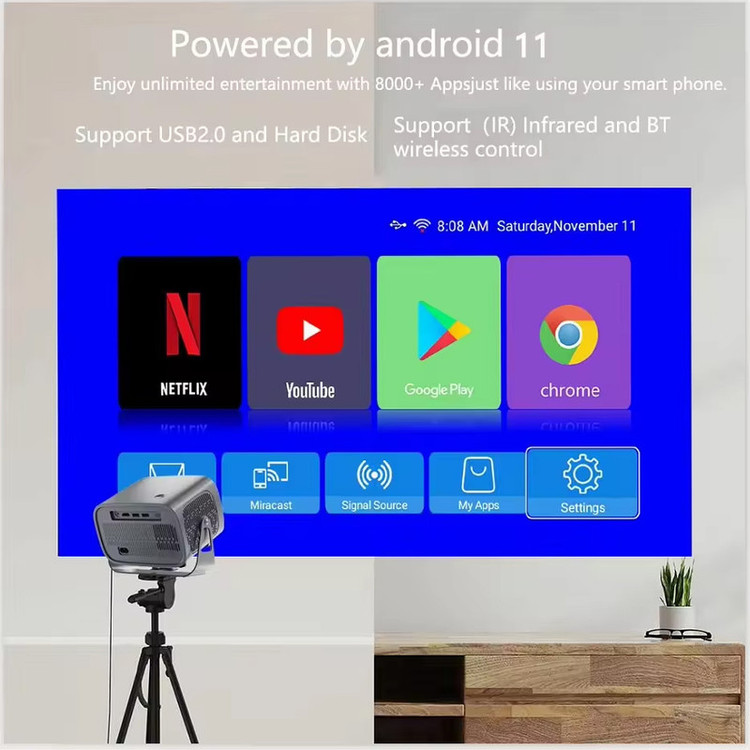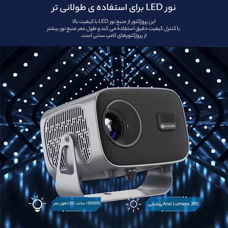 ویدئو پروژکتور بنیوس مدل BE-VP02نسل جدید ویدئو پروژکتورها با پشتیبانی از سیستم عامل اندروید ورژن 11 می باشد.این ویدئو پرژکتور دارای سی پی یو قوی H713 ARM Corxtex-A53