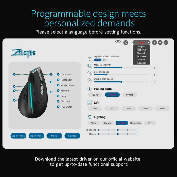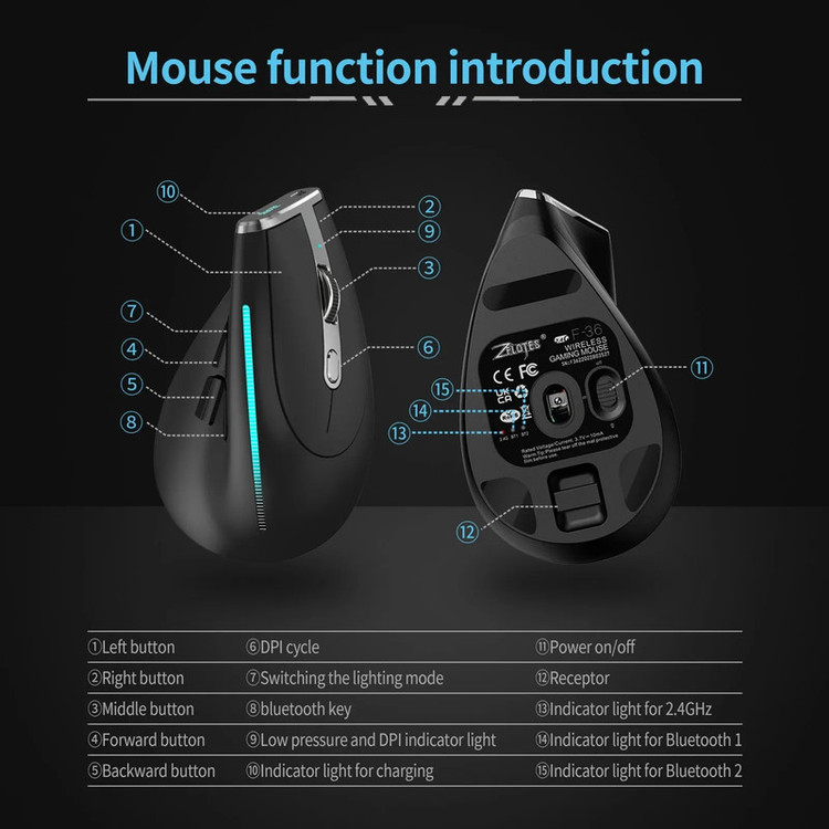 ماوس ZELOTES F36 با طراحی عمودی خود، فشاری که به مچ دست وارد میشود را به طور قابل توجهی کاهش میدهد و برای کار و بازیهای طولانی ایدهآل است. این ماوس با اتصال 2.4G بیسیم، بلوتوث 3.0 و بلوتوث 5.2، به شما امکان میدهد تا به 3 دستگاه به طور همزمان متصل شوید. 8 دکمه قابل برنامهریزی، دقت DPI قابل تنظیم تا 2400 ، نورپردازی RGB و نرافزار مخصوص، از دیگر ویژگیهای این موس هستند. باتری این ماوس قابلیت شارژ شدن را دارا میباشد که هزینه تعویض باتری را یه مقدار چشمگیری کاهش میدهد.
