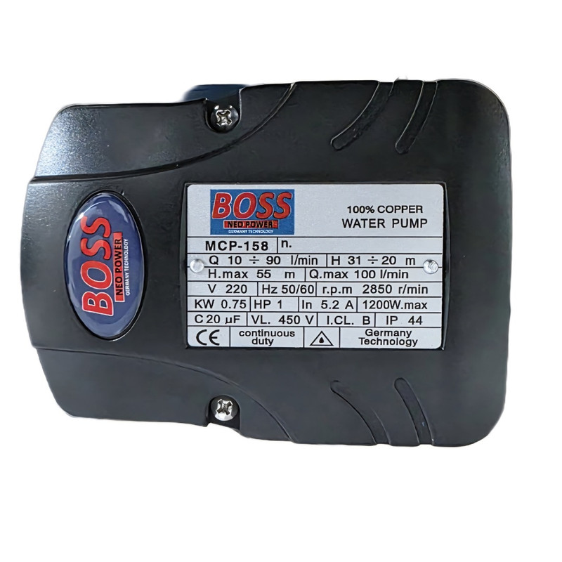 پمپ باس مدل MCP-158 دارای یک پروانه از جنس باکالیت پلاستیک فشرده با شفت استیل،سیم پیچ مس و الکترو موتوری با قدرت یک اسب بخار می باشد. این پمپ یک برند قدیمی و عالی چینی به شمار رفته و در بین انواع پمپ های چینی میتوان به راحتی آن را خریداری کرده و استفاده نمود. از پمپ یک اسب پروانه بشقابی باس برای مواردی که نیاز به هد و دبی بیشتری است استفاده می شود. این پمپ برای آپارتمان های یک تا چهار واحدی مناسب تر می باشد و کاملا بی صدا می باشد