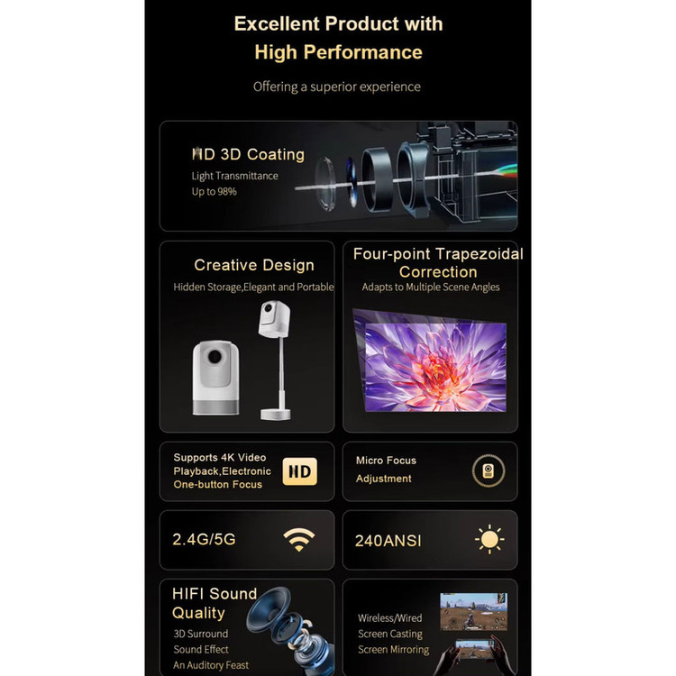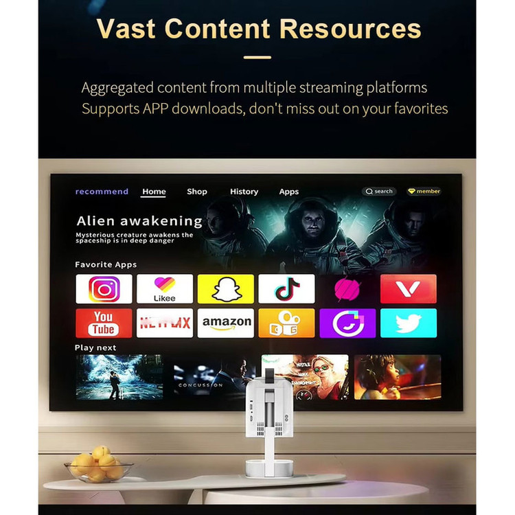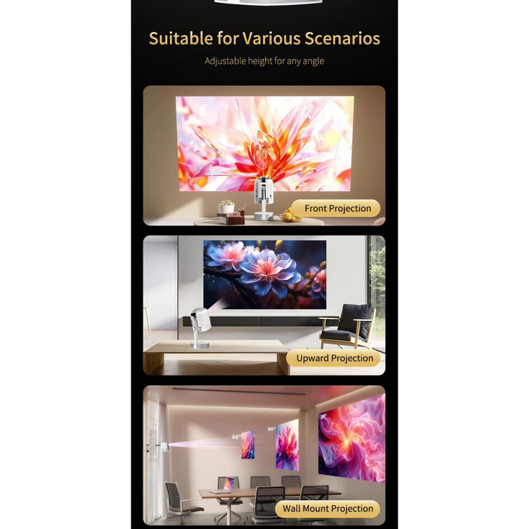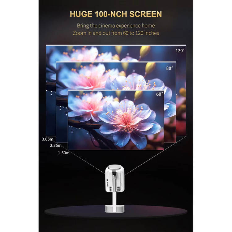 ویدئو پروژکتور بنیوس مدل BE-VP13 دارای سیستم عامل اندروید ورژن 13 یکی از محصولات جدید این کمپانی معروف می باشد.این محصول دارای CPU مدل Amlogic T950S l می باشد.حافظه 8 گیگ و رم یک گیگ دارد که این امکان را به شما می دهد که نرم افزار های اندروید مانند فیلیمو و فیلم نت و یوتیوب و.... ر.ی آن نصب و استفاده نمایید.این ویدئو پروژکتور پر فاصله 1.5-4.5m می تواند تصویر 50-150 inches ایجاد نماید.شما میتوانید با استفاده از قابلیت چرخش سر ویدئو پروژکتور تصاویر را روی دیواد یا روی سقف تماشا نمایید.این ویدیو پروژکتور قابلیت تغییر ارتفاع با استفاده از یک پایه تلسکوپی نیز دارد که ارتفاع آن تا 500 میلی متر زیاد می شود.روی پایه آن اسپیکر با کیفیت 3 واتی تعبیه شده تا مجموعه ای کامل از سینمای خانگی را در اختیار شما قرار دهد.این محصول دارای پورت USB و HDMI است همچنین دارای بلوتوث ورژن 5 و وای فای دو باند نیز می باشد.یک محصول کامل و به روز با قابلیت اتوفوکوس که بنیوس برای شما فراهم نموده است.