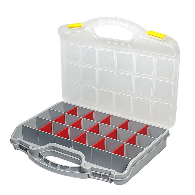 قابلیت تغییر تعداد بخش ها با خارج یا وارد کردن صفحات پلاستیکی بصورت کشویی دارای دو گیره بسیار مستحکم برای بستن جعبه بدون هیچ گونه لقی بدنه بسیار محکم