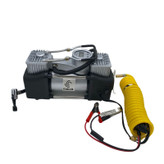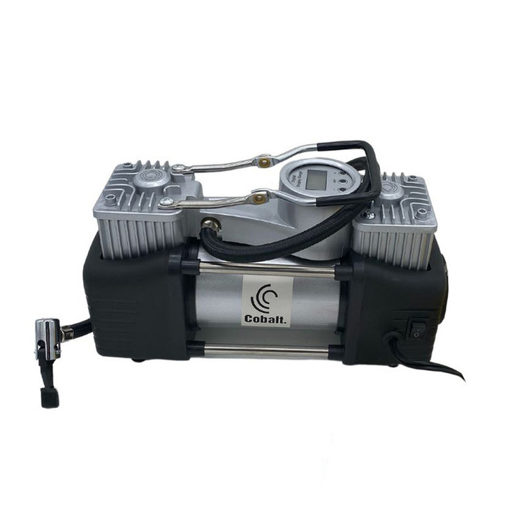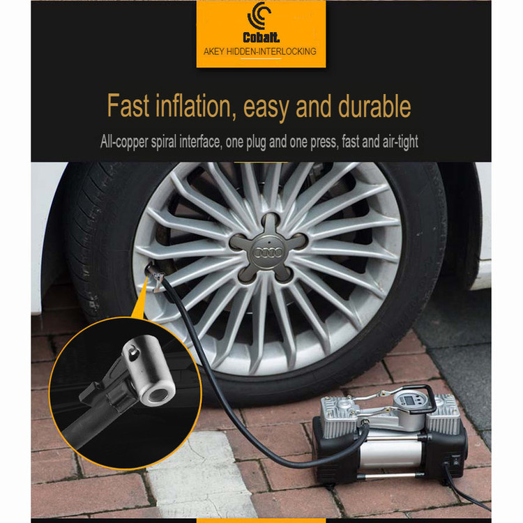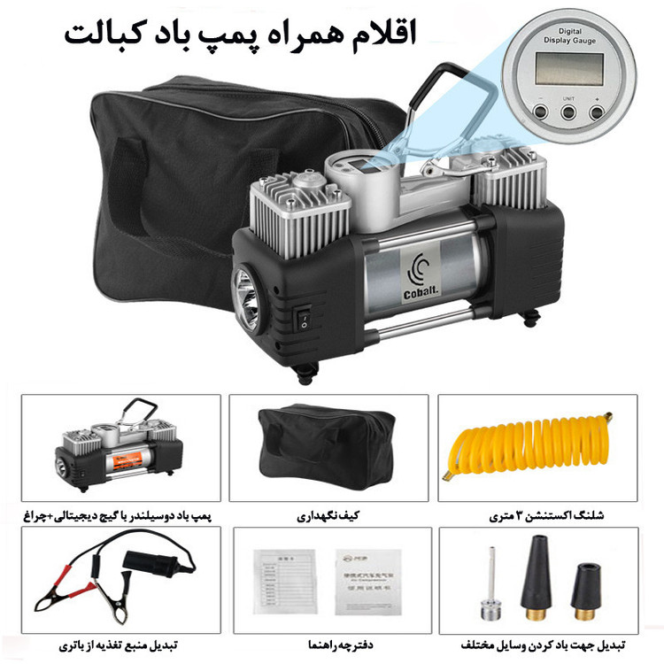 دستگاه پمپ باد دو سیلندر کبالت، لاستیک خودرو با ولتاژ 12 ولت و حداکثر جریان 23 آمپر، به شما امکان افزایش فشار لاستیک خودروتان را با سرعت و کارایی بالا فراهم میکند. این محصول قادر به تولید فشار 150 PSI را دارد. دبی هوای این محصول 65 لیتر بر دقیقه و مجهز به فشارسنج، دستگیره، شلنگ 60سانتیمتری است. این کمپرسور با توجه بهاندازهی کوچکی که دارد و وزن کم بهراحتی در گوشهای از صندوقعقب خودروی شما جای میگیرد و این امکان را به شما میدهد تا در مواقع استفاده بهراحتی و بدون هیچ سختی بتوان از آن استفاده کرد.