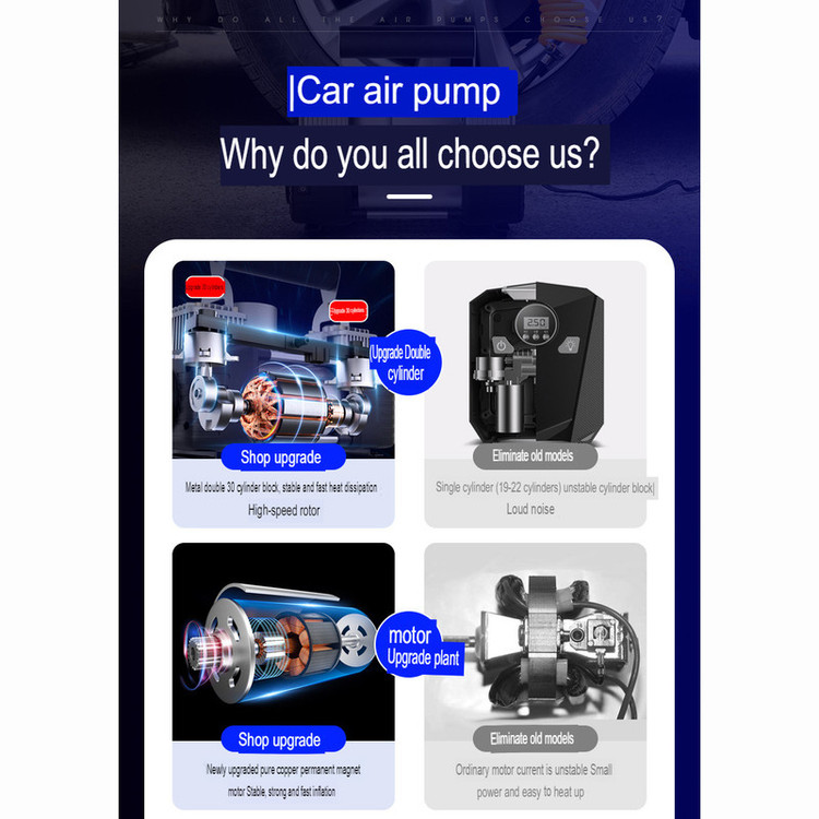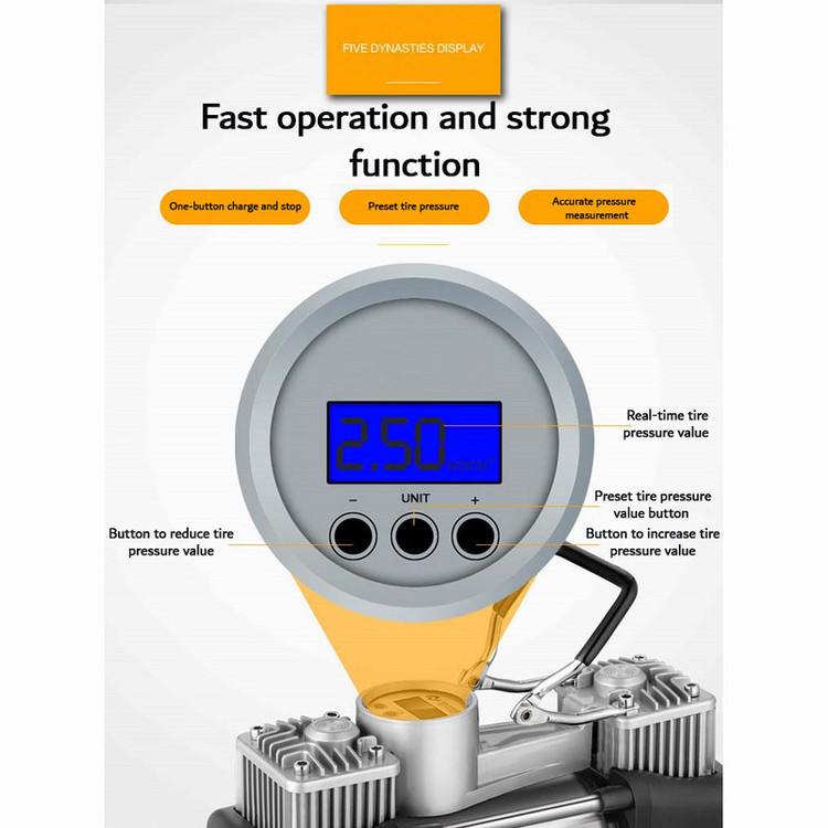 با قابلیت اتصال به باتری یا فندک خودرو، این پمپ باد قابلیت استفاده در هر مکانی را فراهم میکند. علاوه بر این، طراحی دو سیلندر این دستگاه به عنوان یک ویژگی اضافی، سرعت و کارایی پمپاژ را افزایش داده و به شما تضمین میکند که لاستیک خودروتان به سرعت و به صورت یکنواخت پر شود.