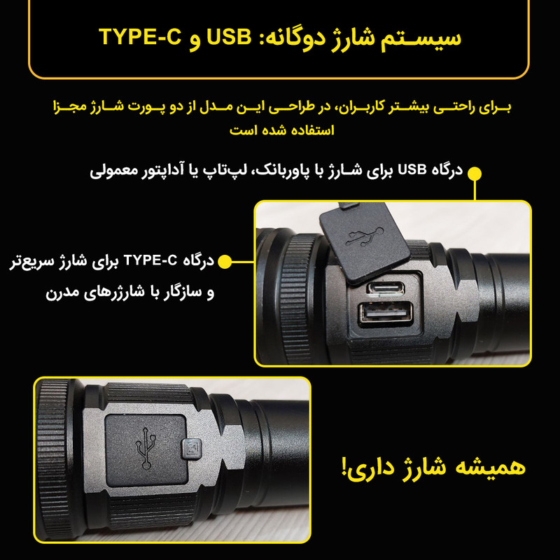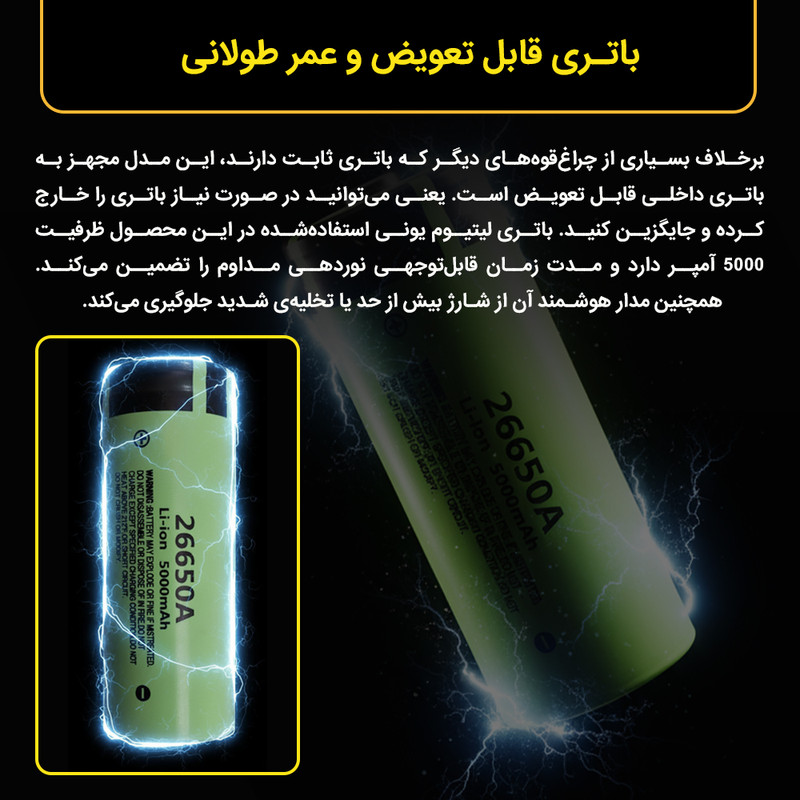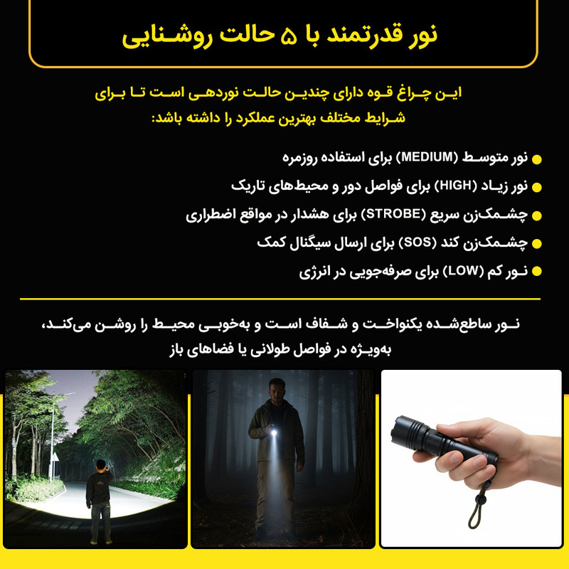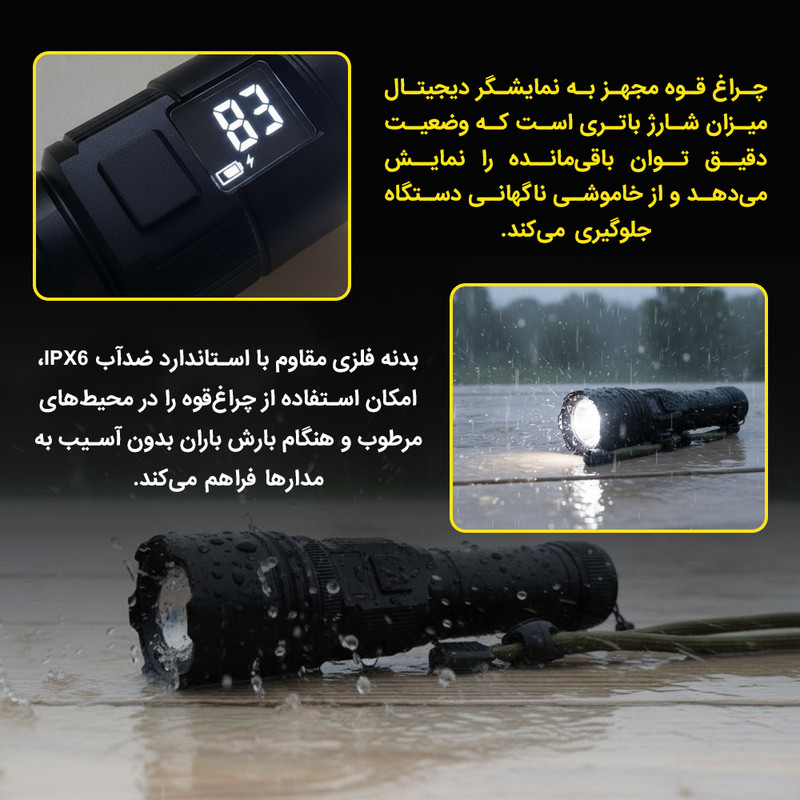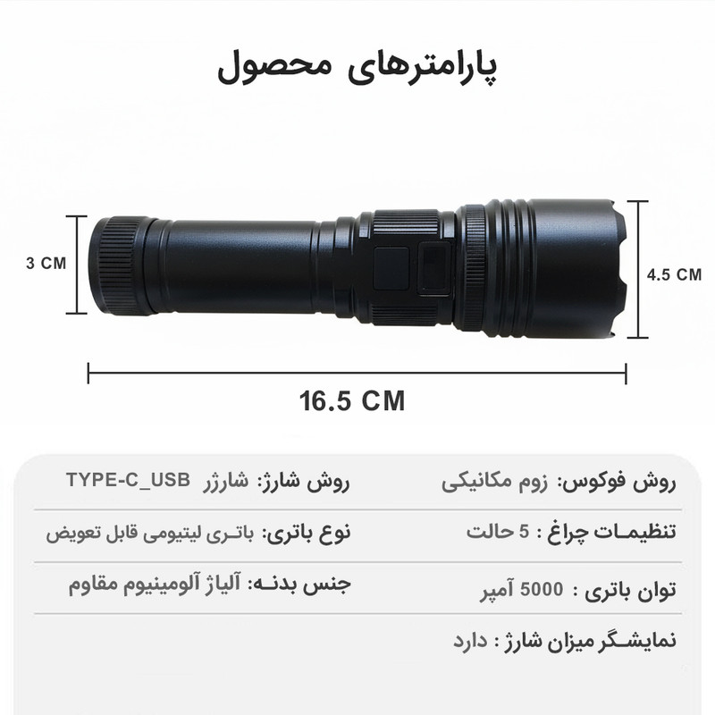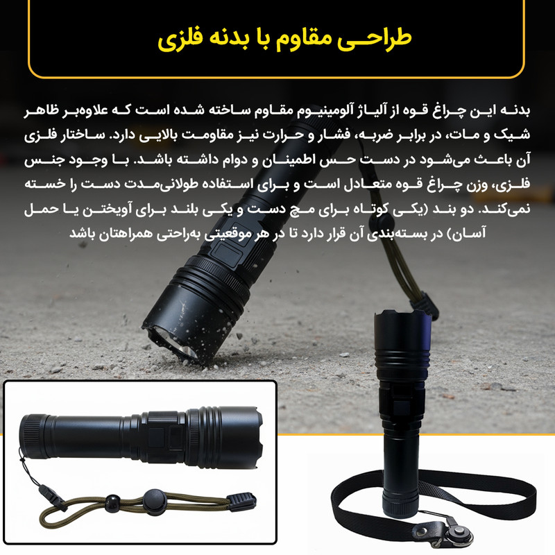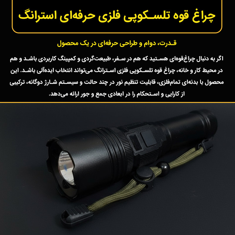 چراغقوهای که از هر نظر بیرقیب است! این چراغ قوه فوق العاده محصول برند استرانگ، بدنهی تمامفلزی و مقاوم آن از آلومینیوم فشرده ساخته شده و در برابر ضربه فوقالعاده مقاوم است. نوری بهقدری قدرتمند دارد که از دیدنش شگفتزده میشوید؛ با بردی طولانی و پرتاب نوری عجیب که محیط اطراف را مثل روز روشن میکند! گلوی تلسکوپی آن امکان تنظیم زاویه نور را بهصورت متمرکز یا پخش فراهم میکند تا در هر شرایطی بهترین دید را داشته باشید. چندین حالت روشنایی دارد و میتوانید شدت نور را بسته به نیازتان تنظیم کنید؛ حتی دارای حالت چشمکزن مخصوص شرایط اضطراری و هشدار است. این چراغقوه همراه با کیف مخصوص حمل ارائه میشود و دو بند بسیار کاربردی دارد؛ یکی بند مچی کوتاه و دیگری بند گردنی که مخصوصاً در سفر، کمپینگ یا استفادههای فنی بسیار مفید هستند. برای مکانیکها، تعمیرکاران، طبیعتگردها، یا حتی استفاده روزمره در خانه و خودرو، این چراغقوه یک وسیلهی ضروری بهشمار میآید—بهویژه در مواقعی که برق قطع میشود! باتری قدرتمند مدل 26650A با ظرفیت ۵۰۰۰ میلیآمپر ساعت دارد که نهتنها قابل تعویض است، بلکه دوام و ماندگاری شارژ آن تحسینبرانگیز است. با پورت تایپسی بهسادگی شارژ میشود و روی بدنه نمایشگر دیجیتال میزان شارژ بهصورت عددی تعبیه شده تا همیشه از وضعیت انرژی دستگاه آگاه باشید. چراغقوهای مدرن، بادوام و حرفهای که هم از نظر قدرت و هم طراحی، شما را شگفتزده خواهد کرد.