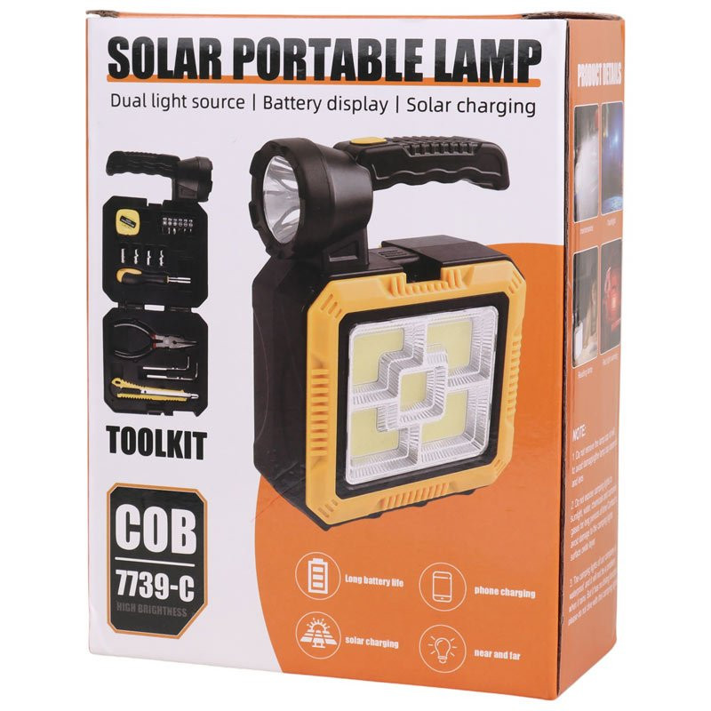 چراغ قوه شارژی همراه با جعبه ابزار مدل 7739-C تشکیل شده از چراغ COB با نوردهی به رنگ مهتابی و قرمز در حالت های ثابت قوی، متوسط و چشمک زن ساخته شده از پلاستیک ABS، مقاوم در برابر آسیب های احتمالی همچون ضربه و فشار، دارای دسته جهت حمل آسان تر. اقلام همراه شامل انبر دم باریک، کاتر، پیچ گوشتی، سری های SL4/ SL5/ SL6/ PH1/ PH2/ ADA، دو عدد سری آلن و متر 1 متری. دارای کلید فیزیکی به منظور خاموش/ روشن کردن و تغییر حالت نوردهی، مجهز به نشانگر LED جهت اطلاع از وضعیت شارژ. دیگر ویژگی مهم بهره مند از پنل خورشیدی به منظور تامین انرژی و از طریق 2 عدد باتری لیتیومی از نوع 18650 قابل تعویض میباشد که به راحتی تعویض می شود و درگاه تایپ سی و کابل همراه. برخوردار از درگاه USB جهت شارژ اضطراری دستگاه های سازگار، مجهز به درپوش به منظور جلوگری از نفوذ گرد و غبار و رطوبت به داخل پورت. حالت نور دهی این چراغ قوه 5 مدل مختلف می باشد. حالت اول نور از جلو با قدرت بالا. حالت دوم نور از جلو با قدرت متوسط. حالت سوم نور از پنل جانبی. حالت چهارم پنل جانب نور قرمز و حالت آخر نور قرمز چشمک زن برای اخطار خطر و احتیاط می باشد که در شرایط مختلف کاربرد بسیار زیادی دارد. لازم به ذکر هست برای شارژ دستگاه با پنل خورشیدی نیاز به حدود 20 ساعت نوردهی می باشد.