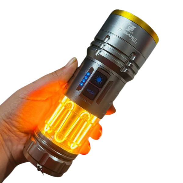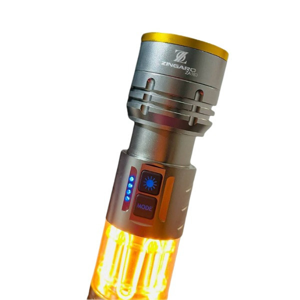 یکی از ممتازترین مدلهای چراغ قوه موجود در بازار چراغ قوه زینگارو مدل Zingaro ZA183 است که از کیفیت ساخت بالا و قدرت نوری حیرت آوری برخوردار است. این چراغ قوه حرفه ای با ویژگی های منحصر به فرد و ساختاری مقاوم انتخابی برتر برای کمپینگ و گلمپینگ ها و انواع برنامه های ماجراجویانه می باشد. چراغ قوه شارژی حرفه ای زینگارو مجهز به یک لامپ LED با نور قدرتمند و شدت روشنایی ۴۰۰۰ لومن است که محوطه های تاریک مطلق را کاملا پر نور میکند و دید وسیعی را برای افراد فراهم می آورد. شدت روشنایی فوق العاده در کنار برد نوری شگفت انگیز ۱۰۰۰ متری سبب شده همراهی مطمئن و قدرتمند برای کوهنوردان حرفه ای نیروهای امداد و نجات و طبیعت گردی شبانه باشد. این چراغ قوه از حالتهای مختلف نوردهی شامل نور زیاد (High) نور متوسط (Medium) و نور کم (Low) پشتیبانی می کند که هر کدام در شرایط خاص قابل استفاده است. همچنین در این چراغ قوه همه کاره حالت چشمک زن اضطراری (SOS/Strobe) تعبیه شده است که برای مواقع اضطراری و درخواست کمک ایده آل است. علاوه بر قدرت نوری خیره کننده ، چراغ قوه از ساختاری مستحکم و با دوام برخوردار است که در شرایط سخت محیطی مقاومت بی نظیری دارد بهره گرفتن از جنس آلیاژ آلومینیوم مقاوم این اطمینان را به شما میدهد که انتخابی با دوام برای استفادههای طولانی مدت در شرایط سخت محیطی داشته اید. یکی از امکانات ویژه این چراغ مجهز بودن به چراغ جانبی فانوسی است که روشنایی یکنواختی را فراهم می آورد و برای زمان قطعی برق یا استفاده در داخل چادر فوق العاده است. چراغ قوه کینساچ مدل zingaro za183 از نظر ظاهری فوق العاده حرفه ای مدرن و شیک طراحی شده است قسمتی از بدنه از شیشه مقاوم ساخته شده است که وجود چراغ های زرد رنگ جذابیت ظاهری چراغ قوه را دوچندان کرده است. مزیت دیگری که این چراغهای زرد رنگ دارند کمک به پیدا کردن سریع و راحت چراغ قوه در زمان تاریکی مطلق میباشد. طراحی ارگونومیک و خوش دست در کنار وزن سبک آن سبب شده به سهولت در دست جای بگیرد و در ماجراجویی های طولانی خسته کننده نباشد. جنس بدنه از آلیاژ آلومینیوم مقاوم است که در برابر ضربه و سقوط از ارتفاع متوسط مقاومت بی نظیری دارد به دلیل مقاومت بالا در شرایط سخت محیطی می توان گفت عملکرد قابل اطمینانی در ماموریت های امداد و شرایط اضطراری و موقعیتهای سخت دارد.