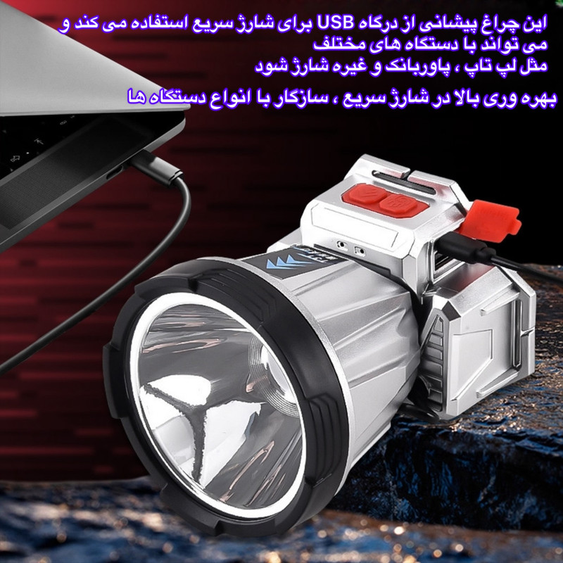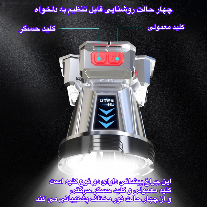 منبع نور این چراغ از LED پرقدرت تشکیل شده و دارای چهار حالت روشنایی (نور قوی، متوسط، چشمکزن و اضطراری) است تا بتواند در شرایط مختلف نوری بهترین عملکرد را ارائه دهد. باتری داخلی لیتیومی با ظرفیت بالا از طریق درگاه USB شارژ میشود و با 3 تا 6 ساعت شارژ کامل، میتواند بین 4 تا 9 ساعت روشنایی مداوم تولید کند.