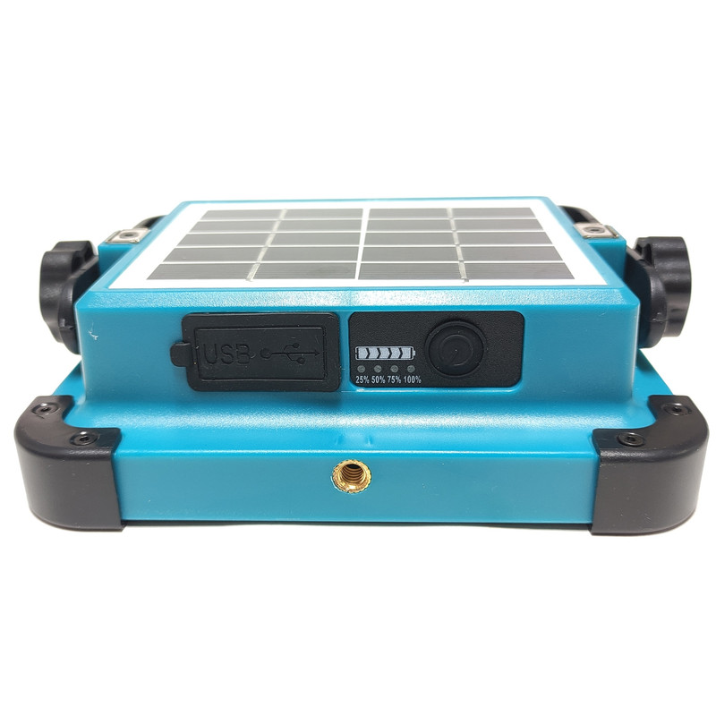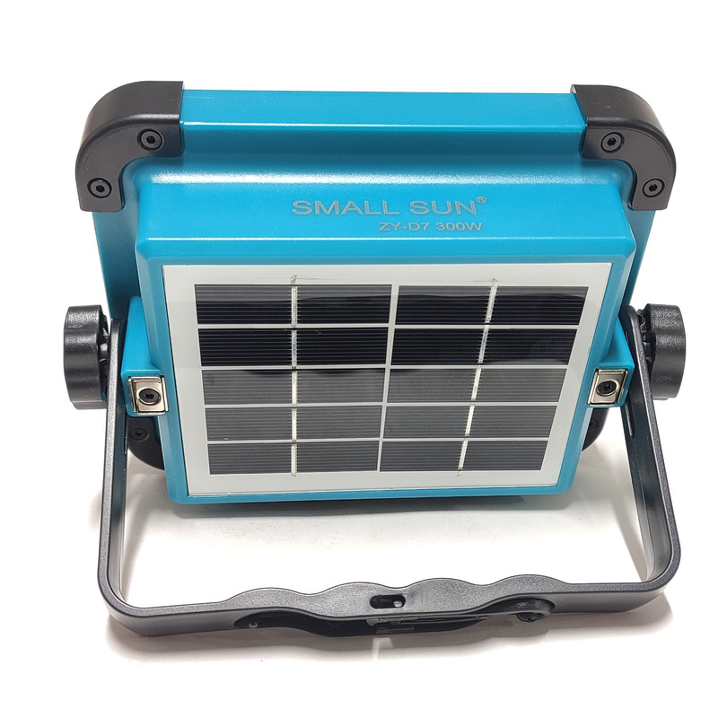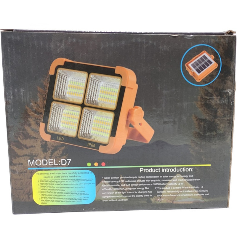 نورافکن شارژی خورشیدی مدل D7 وسیله ایی مناسب برای سفر و کمپینگ است، جنس بدنه این لامپ از پلاستیک محکم ساخته شده ،و دارای نور بسیار قوی و درخشان می باشد. قدرت نور این لامپ 300 وات و دارای 4 حالت نوردهی به ترتیب: مهتابی، آفتابی، ترکیب آفتابی و مهتابی، چشمک زن پلیسی که از حالت چشمک زن آن میتوان برای مواقع اضطراری استفاده کرد. پروژکتور شارژی خورشیدی 300 وات بعد از شارژ کامل آن، می توان به مدت 4 تا 8 ساعت از نور آن لذت برد. لامپ شارژی خورشیدی دارای دسته نگهدارنده، پایه ی قابل تنظیم و همچنین مگنت آهنربایی برای نصب می باشد.نورافکن شارژی خورشیدی مدل D7 بسیار زیبا و خوش حالت طراحی شده است.