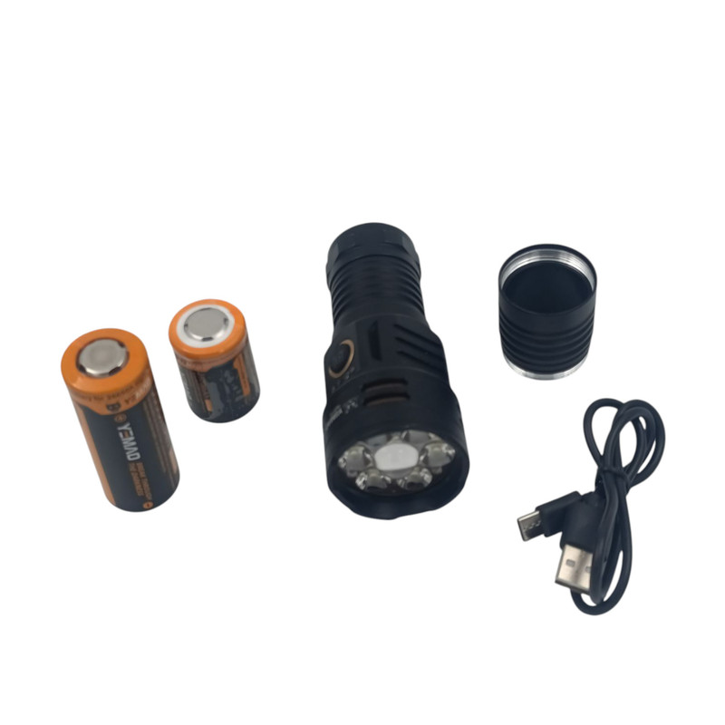 این محصول از آلیاژ آلومینیوم ساخته شده و دارای عملکرد ضد آب روزانه است.دانههای لامپ LED با روشنایی بالا ۱*TG و دانههای لامپ ۶*P35، کممصرف و بادوام می باشند. از باتری لیتیومی ۱*۲۶۳۵۰A استفاده کنید یا یک لوله رابط برای استفاده از باتری لیتیومی ۱*۲۶۶۵۰A، شارژ Type-C، اضافه کنید. آهنربای قدرتمند روی دم برای برآوردن نیازهای کاری به کار گرفته می شود.