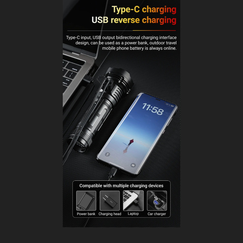 این محصول از آلیاژ آلومینیوم ساخته شده است که میتواند در برابر آب مقاوم باشد.از باتری لیتیومی 1*32850A و شارژ Type-C استفاده کنید. قابل استفاده به عنوان پاور بانک دارد. حالت دنده: به ترتیب روی دکمه روشن کلیک کنید. (نور ضعیف، نور متوسط، نور قوی، چشمک زن، SOS) برای خاموش کردن چراغ قوه، کلید روشن را در هر دندهای فشار داده و نگه دارید. عملکرد شارژ: USB TYPE-C در حین شارژ، چراغ نشانگر سوئیچ قرمز میشود، نشان دهنده شارژ است. چراغ نشانگر سوئیچ سبز میشود، نشان دهنده پر شدن باتری است.