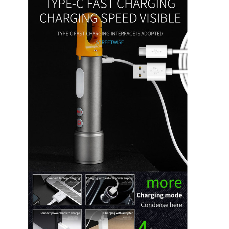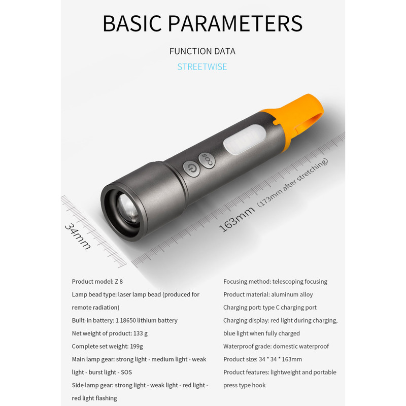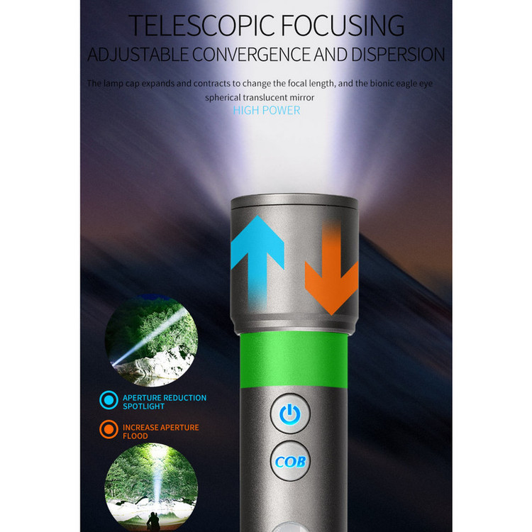 【Stretch Zoom】 چراغ قوه می تواند آزادانه محدوده تابش را با زوم کشش تغییر دهد، سوئیچ نور و نور افکن را بی نهایت تحقق بخشد، آسان برای مقابله با سناریوهای مختلف مانند روز خانواده، نورپردازی کمپینگ، پیاده روی میدان، سواری شب و غیره می باشد.