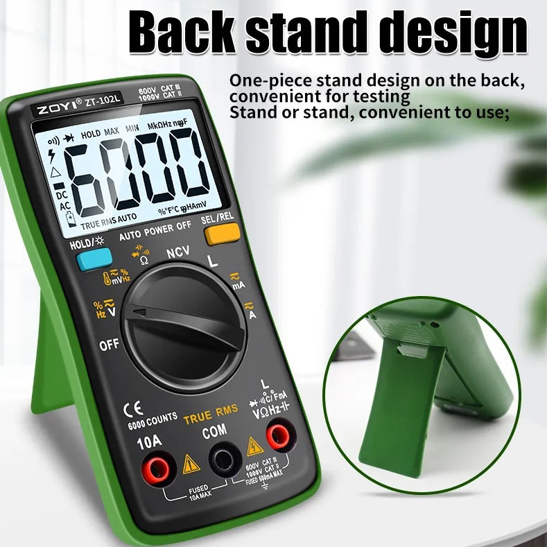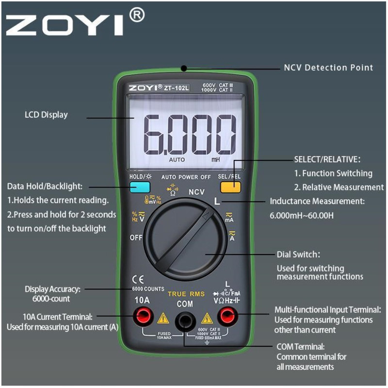 - اندازه گیری سلف تا 60.00H - NCV، تابع تست ولتاژ غیر تماسی - دارای قابلیت اندازه گیری واقعی True RMS - قابلیت اندازه گیری دیوتی سایکل از 1 تا 99 درصد - دارای قابلیت خاموش شدن خودکار بعد از 15 دقیقه