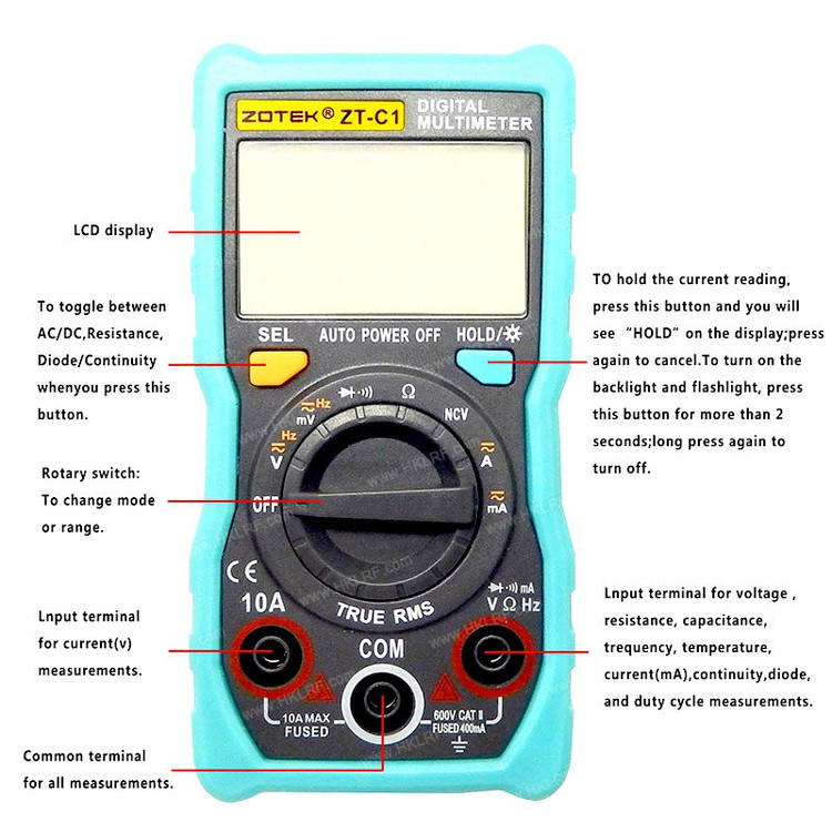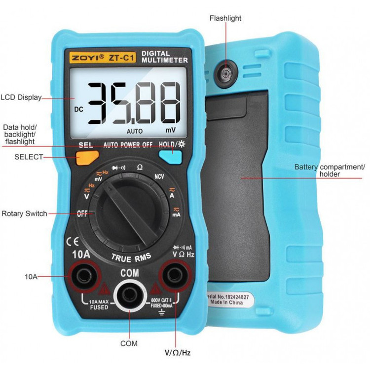 ویژگیهای مولتیمتر: گسترهیابی اتوماتیک , تست دیود , تست خازن , تداوم قابل شنیدن , RMS صحیح