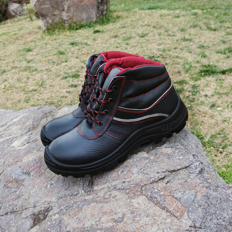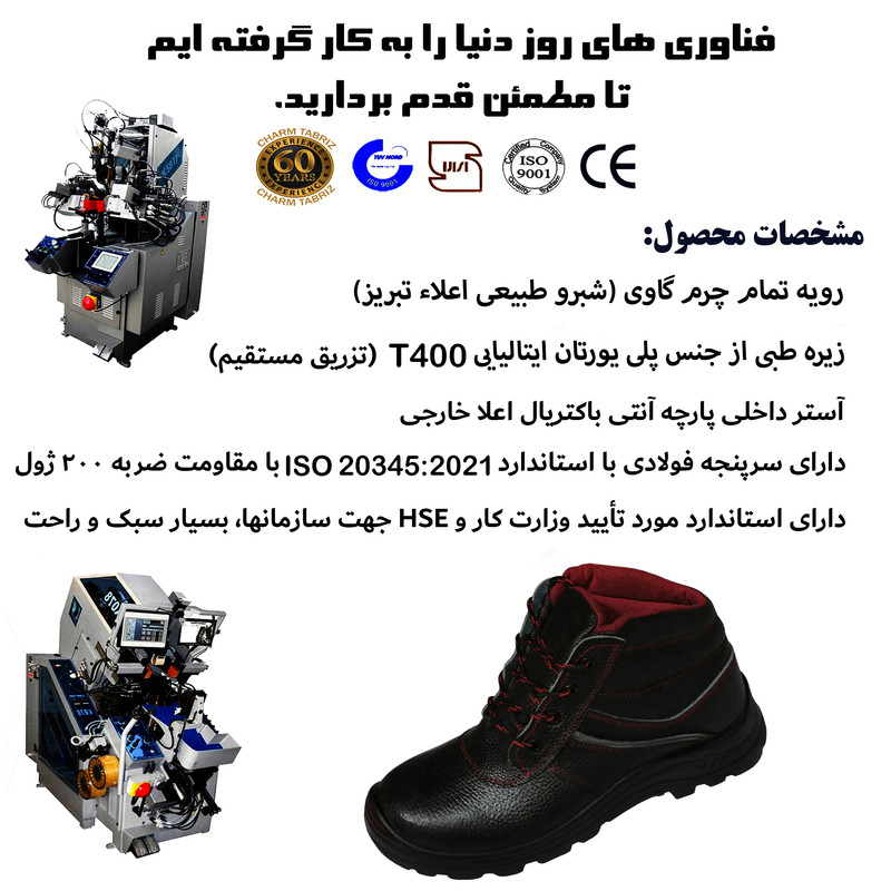 رویه ای از جنس چرم طبیعی گاوی،مچ گیر پا از جنس اشبالت جهت حرکت بهتر،آستر پارچه آنتی باکتریال،زیره تزریق مستقیم از جنس پلی یورتان T۴۰۰ ایتالیایی(ضد سایش،لغزش و کاهش فشارهای وارده) تولید شده تحت استاندارد وزرات کار و دارای تاییدیه HSE