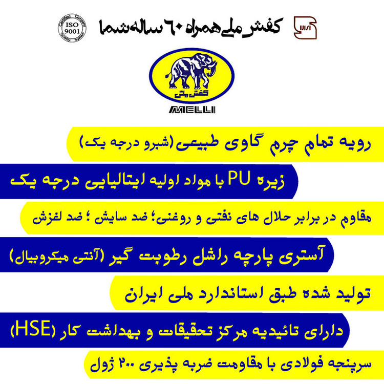 رویه ای از جنس چرم طبیعی گاوی آستر پارچه آنتی باکتریال زیره تزریق مستقیم از جنس پلی یورتان T400(ضد سایش،لغزش و کاهش فشارهای وارده) سرپنجه فولادی تولید شده طبق استاندارد سازمان کار