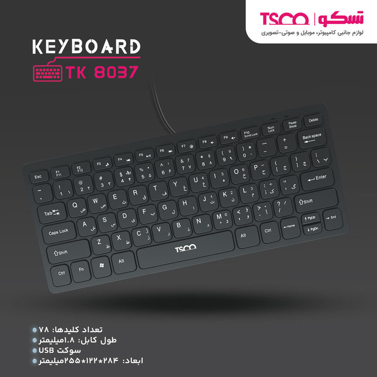 کیبورد تسکو مدل TK 8037، ظاهری مینیمال و جمعوجور دارد. این کیبورد، با ابعاد 28.4x12.2x25.5cm و کلاس وزنی 246 گرم، از سری کیبوردهای مینی تسکو محسوب میشود. کیبوردهای مینی دکمههای ماشینحساب سمت راست کیبوردهای معمولی را ندارند. در نتیجه حملونقل و استفاده از آنها بسیار سادهتر است.