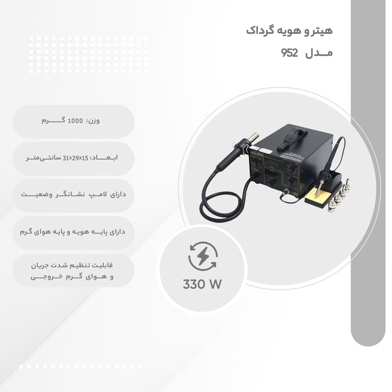 سایر توضیحات: دیجیتال , قابلیت تنظیم شدت جریان و هوای گرم خروجی - دارای پایه هویه و پایه هوای گرم