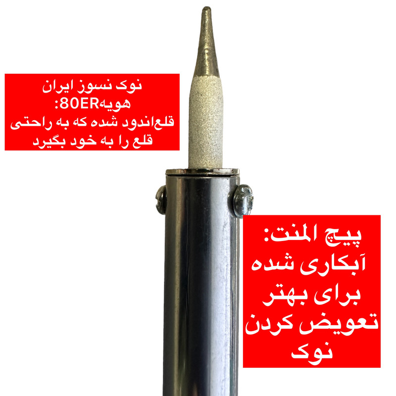 سایر توضیحات: هویه 80 وات قلمی ایران هویه ولتاژ کاری تا حداکثر 240 ولت و نوک نسوز و قلع اندود شده که به راحتی قلع را به خود می گیرد و ذوب می کند