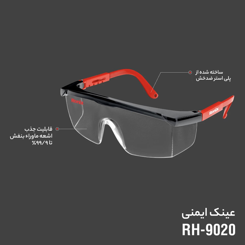ضدخش و ضد بخار دارای جنس پلی استر ضدخراش قابلیت تنظیم طول دسته عینک در 4 حالت مختلف تولید شده براساس استاندارد های ANCL آمریکا وCE اروپا وEV حداکثر شفافیت به منظور دید بهتر و کارایی بیشتر قابلیت جذب اشعه فرابنفش تا 99.9% کیفیت بالا ومنحصر به فرد