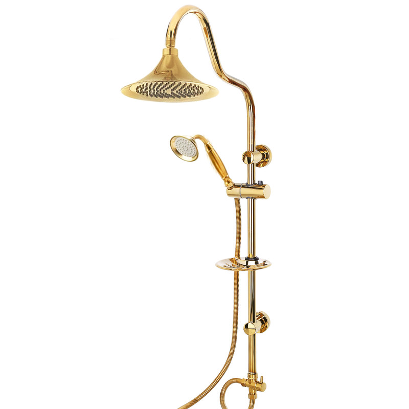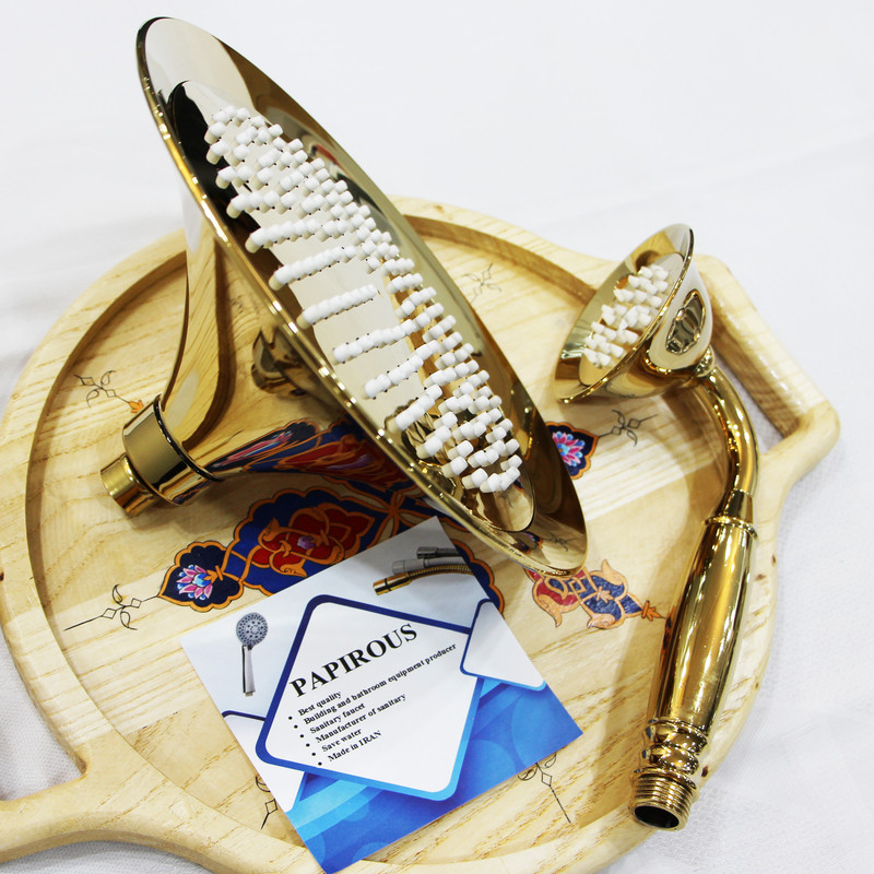 پوشش طلایی تحت خلا، سایز اتصالات استاندارد و قابل اتصال به تمامی لوله های دوش و شلنگ دوش استاندارد. مجهز به نازل های سیلیکونی، تعداد زیاد نازل اب جهت پخش مناسب آب،