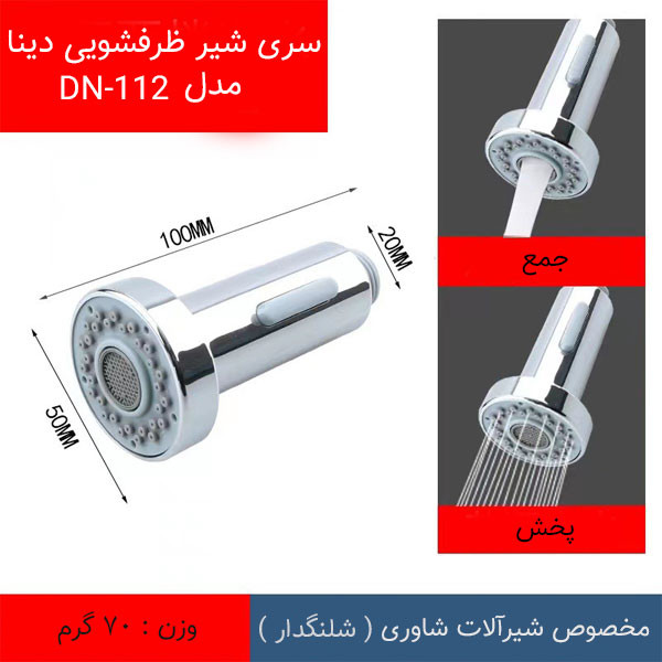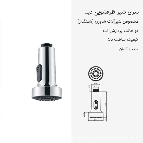 - دارای دو حالت پردازش آب - مخصوص شیرالات شاوری (شلنگدار) - برای شناسایی اصل بودن محصول حتما به بسته بندی با برند (( Dina )) توجه بفرمایید.