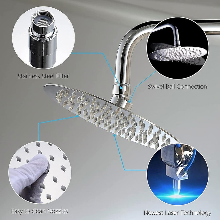 مجهز به منافذ پلیمری که رسوب زدایی را راحت میکند، تعداد زیاد نازل اب جهت پخش مناسب آب، دارای جاصابونی، شلنگ استیل ریزبافت، قابلیت تنظیم ارتفاع گوشی، دارای پیچ و رول پلاک برای نصب