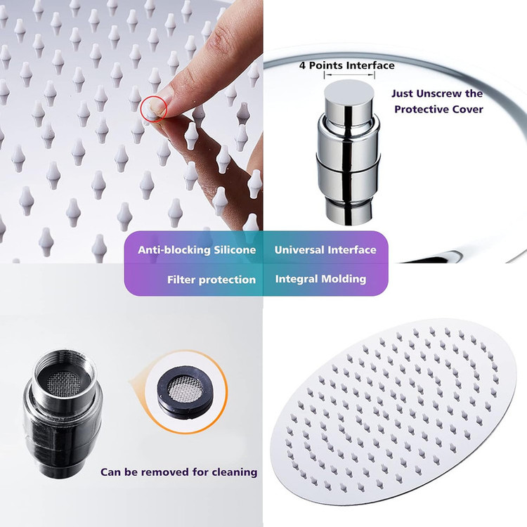 مجهز به منافذ پلیمری که رسوب زدایی را راحت میکند، تعداد زیاد نازل اب جهت پخش مناسب آب، دارای جاصابونی، شلنگ استیل ریزبافت، قابلیت تنظیم ارتفاع گوشی، دارای پیچ و رول پلاک برای نصب