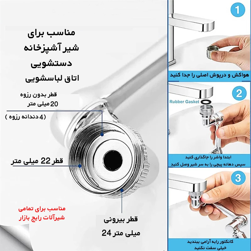 نصب بسیار راحت، سایز قطر این سری شیر آب برای تمامی شیرهای روشویی و آشپزخانه رایج بازار ایران مناسب میباشد. دوحالت پاشش آب