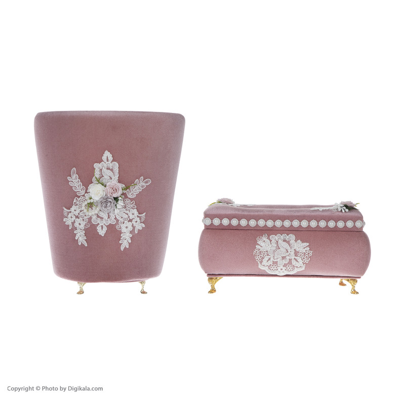ست سطل زباله و جای دستمال کاغذی میتواند بر زیبایی دکوراسیون خانه شما تاثیر فراوانی داشته باشد. در واقع این محصولات در طرح، رنگ و جنسهای مختلفی طراحی و تولید میشوند که هرکدام به نوعی میتوانند مفید واقع شوند. محصولی که مشاهده میکنید، ست سطل زباله و جای دستمال کاغذی کد 003 است. این محصول دارای ابعاد 32 × 25.5 × 25.5 سانتیمتر بوده و وزنی معادل 610 گرم دارد. همانطور که مشاهده میکنید، این محصول دارای پارچه ظریف و نرم از جنس مخمل بر روی سطل و جای دستمال کاغذی است که سبب شده تا به نوعی بتواند علاوه بر کیفیت و طول عمر محصول، دارای زیبایی منحصربهفردی نیز باشد. همچنین محصول فوق دارای طرح گل بر روی هر دو محصول بوده که به زیبایی آن افزوده است. این محصول دارای پایهای طلایی رنگ نیز است که با توجه به رنگ صورتی پارچه توانسته ترکیب رنگ چشمگیری را برای خود داشته باشد.