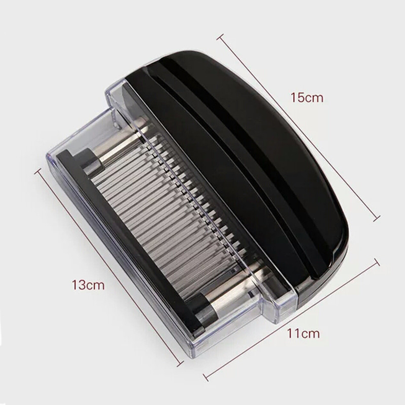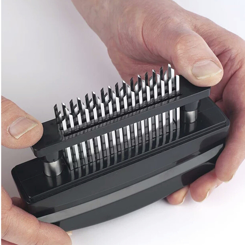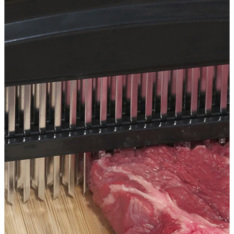 دستگاه ترد کننده گوشت مدل H109 از 48 عدد سوزن استیل مخصوص تشکیل شده است که با فشار دادن دستگاه روی گوشت و استیک، منجر به کاهش آب گوشت ،کاهش زمان پخت گوشت تا 40% و همینطور تردی گوشت شده و همچنین سوراخ های ریز سطحی روی گوشت ایجاد میکند که باعث می شود آب نمک، سرکه ، و ادویه جات و طعم دهنده های مورد نظر شما که گوشت یا ماهی خود را در آن میخوابانید براحتی جذب گوشت شود.